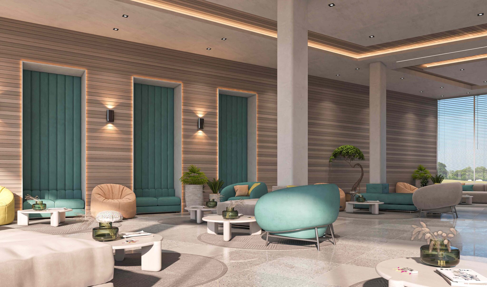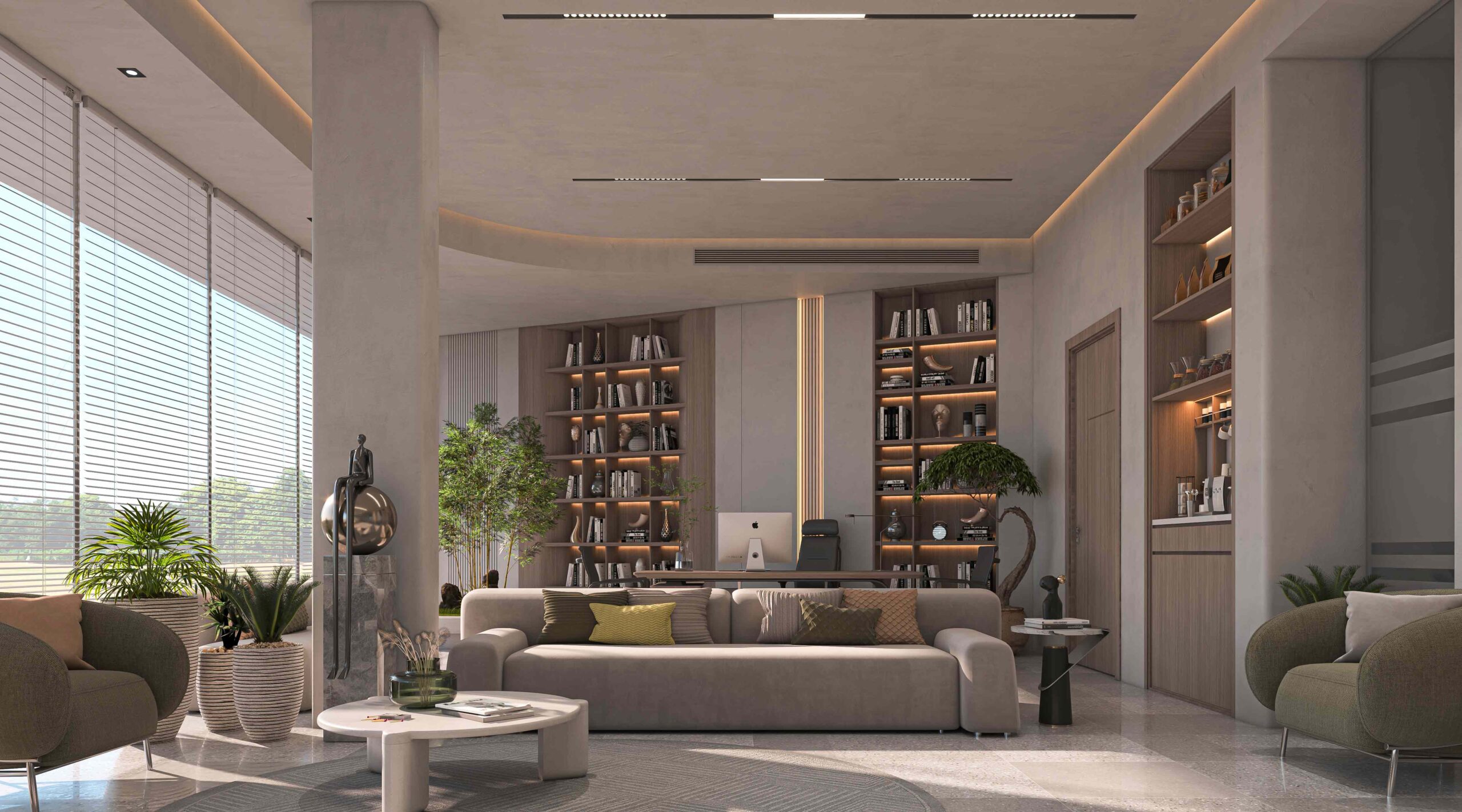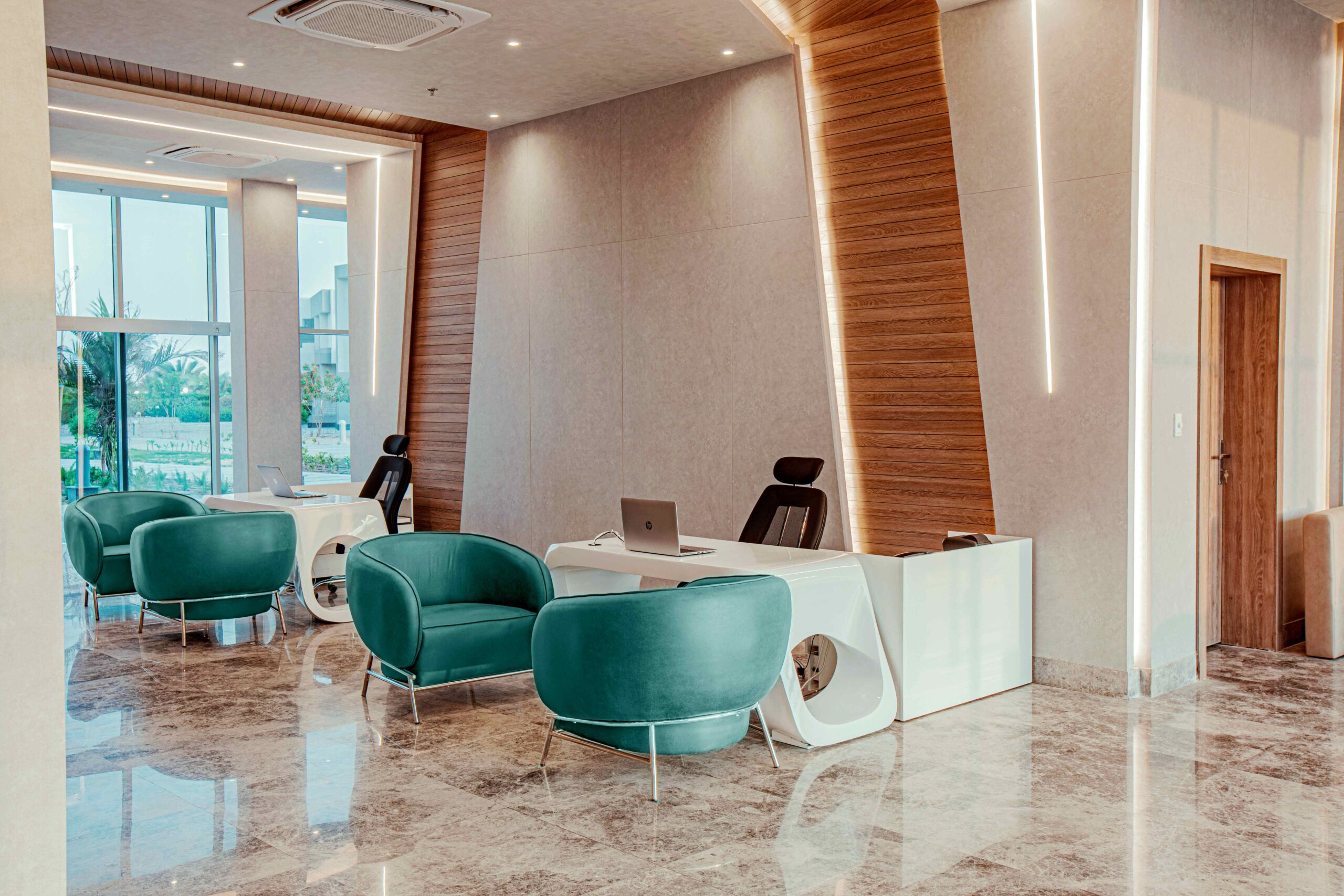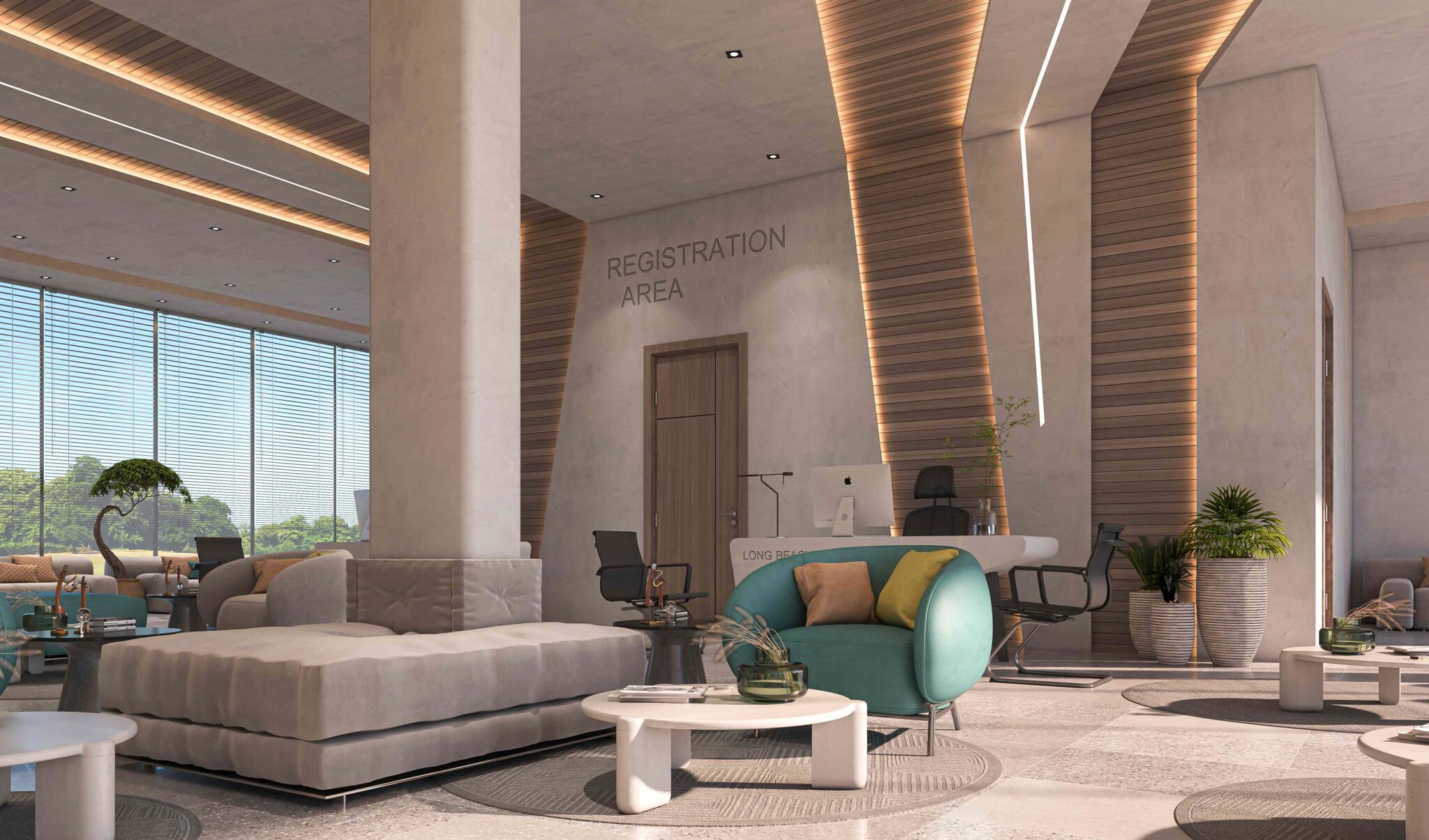 Zia Company has the credit for designing and constructing a sophisticated hotel lobby that blends contemporary elegance with a welcoming atmosphere, providing guests with a refreshing and stylish first impression upon arrival.