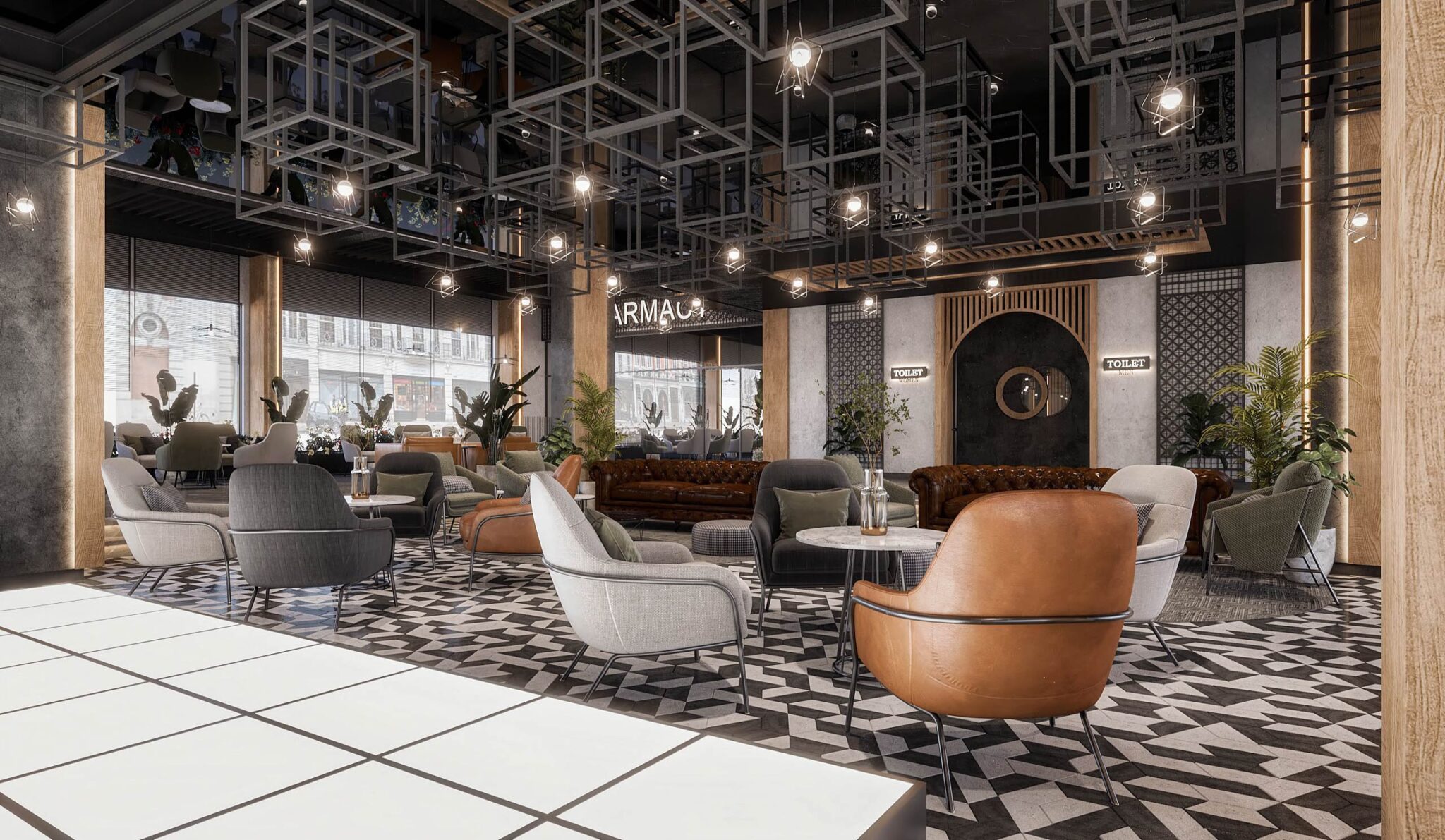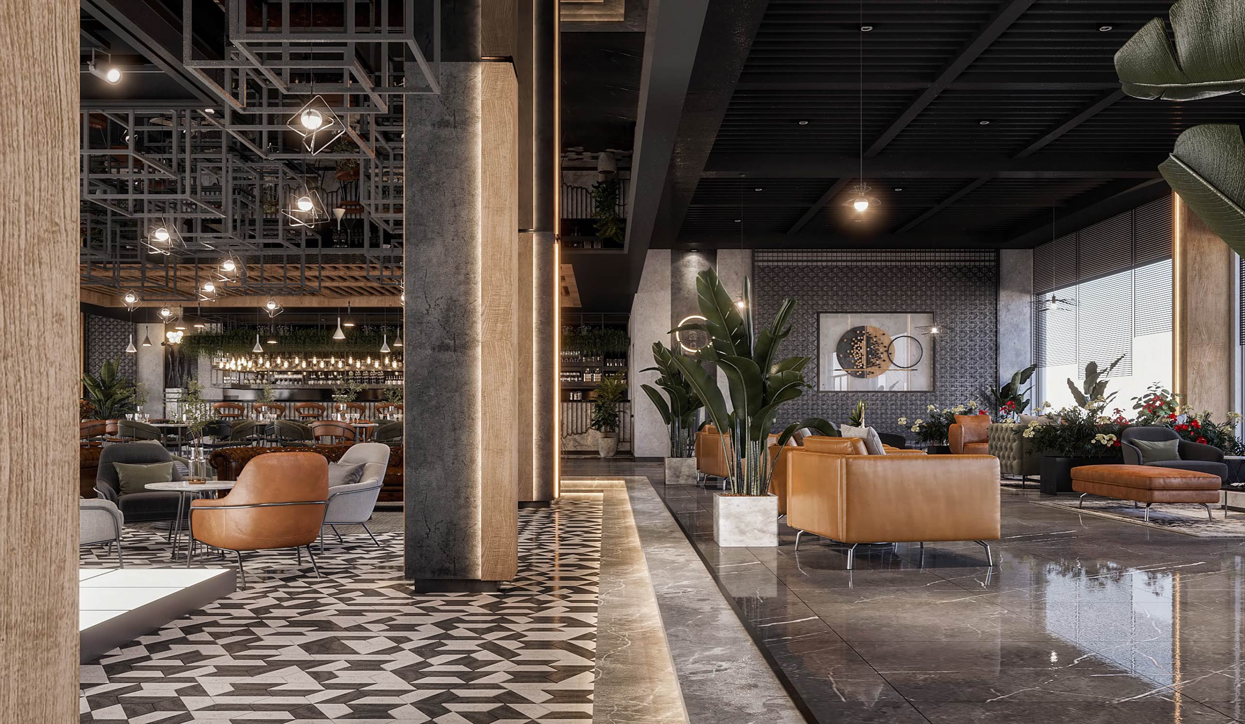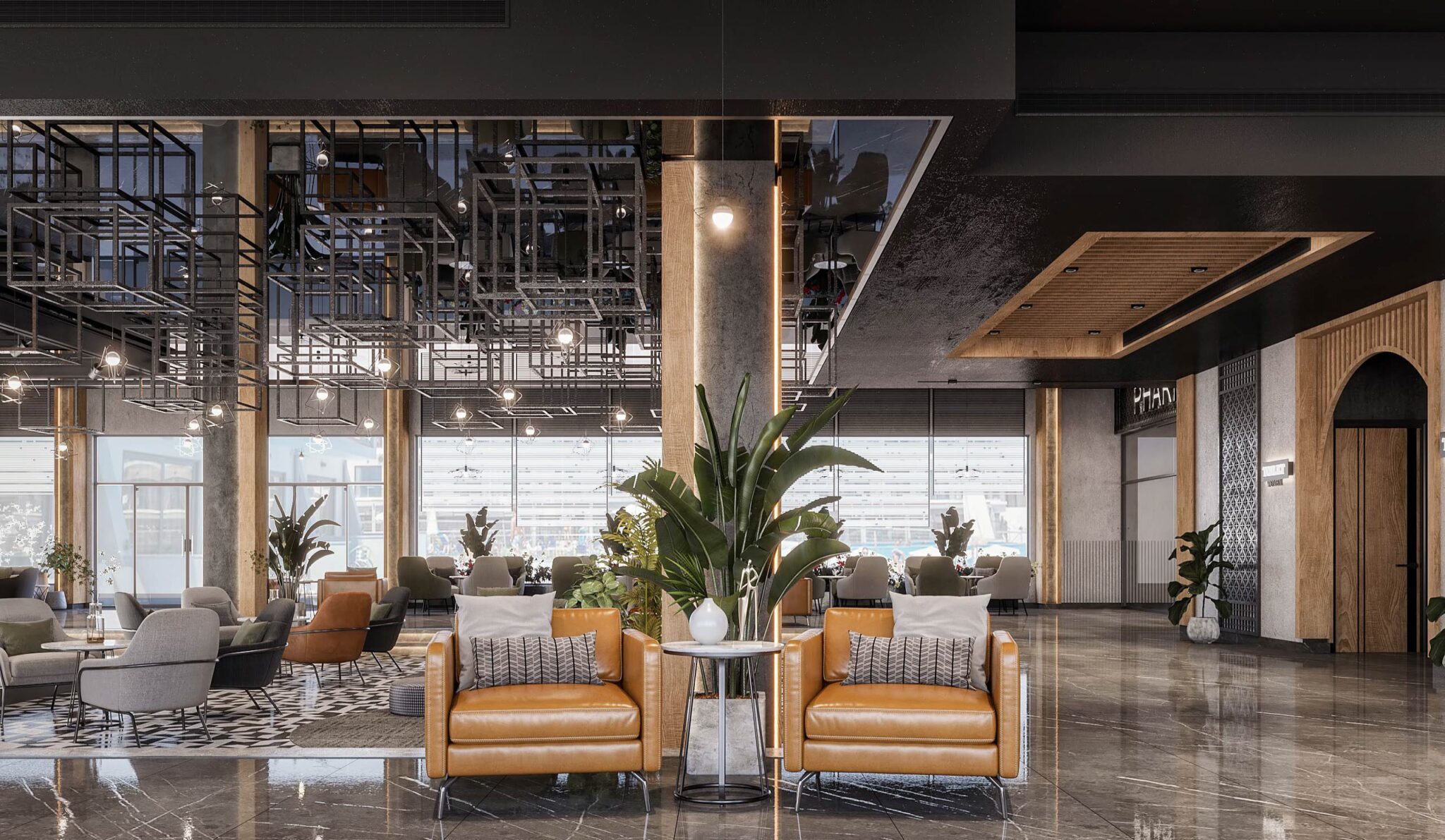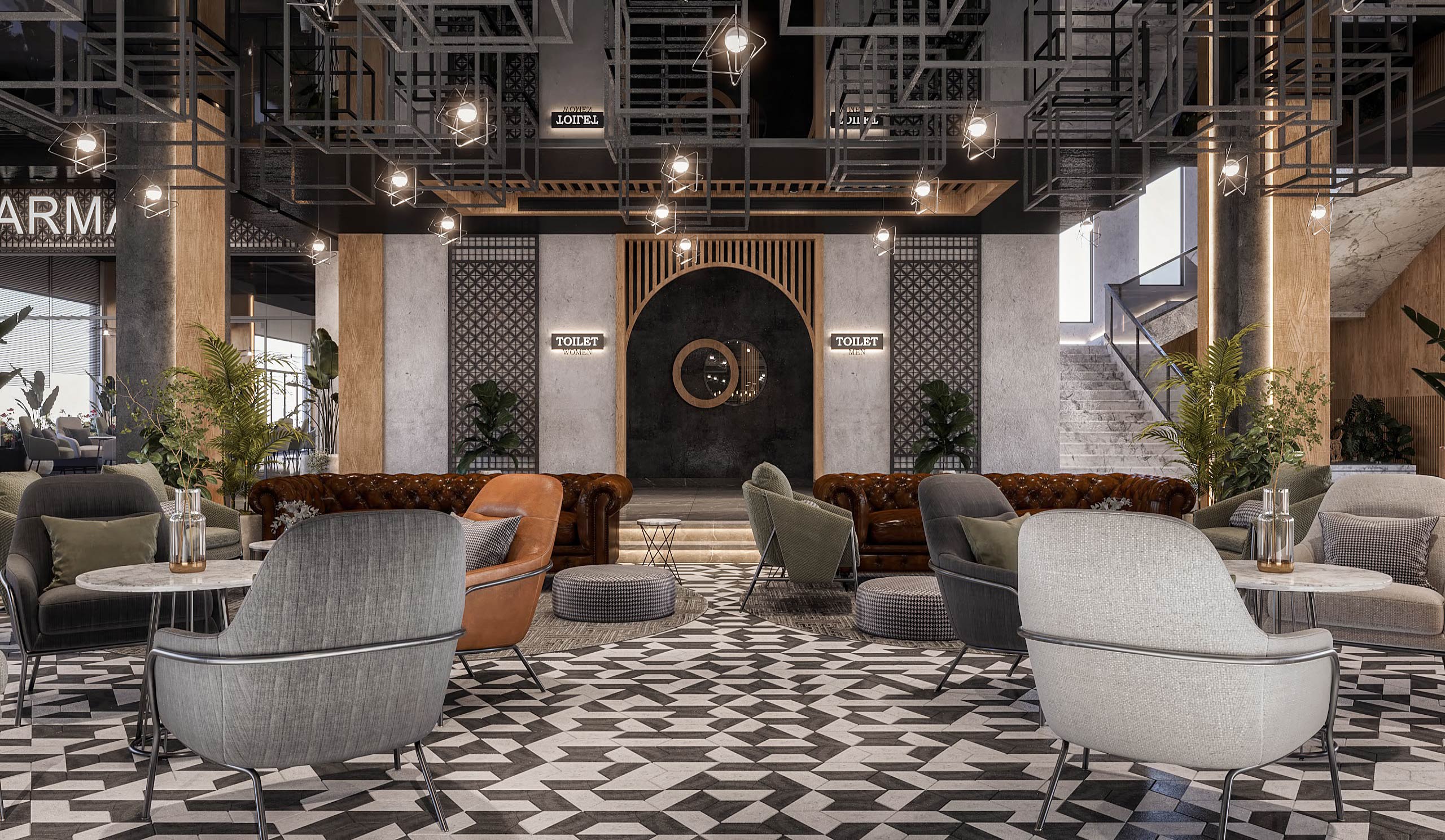 launge Total Area: 1320 m2 launge Zia Company has the credit for designing a stylish hotel lounge that seamlessly blends contemporary design with comfort. The space features elegant furnishings and ambient lighting, offering guests a relaxed and inviting environment. Total Area: 1320 m2