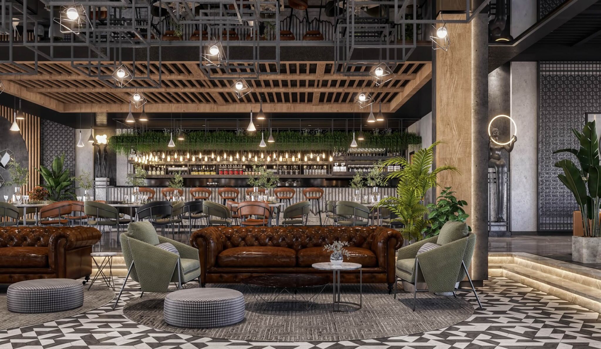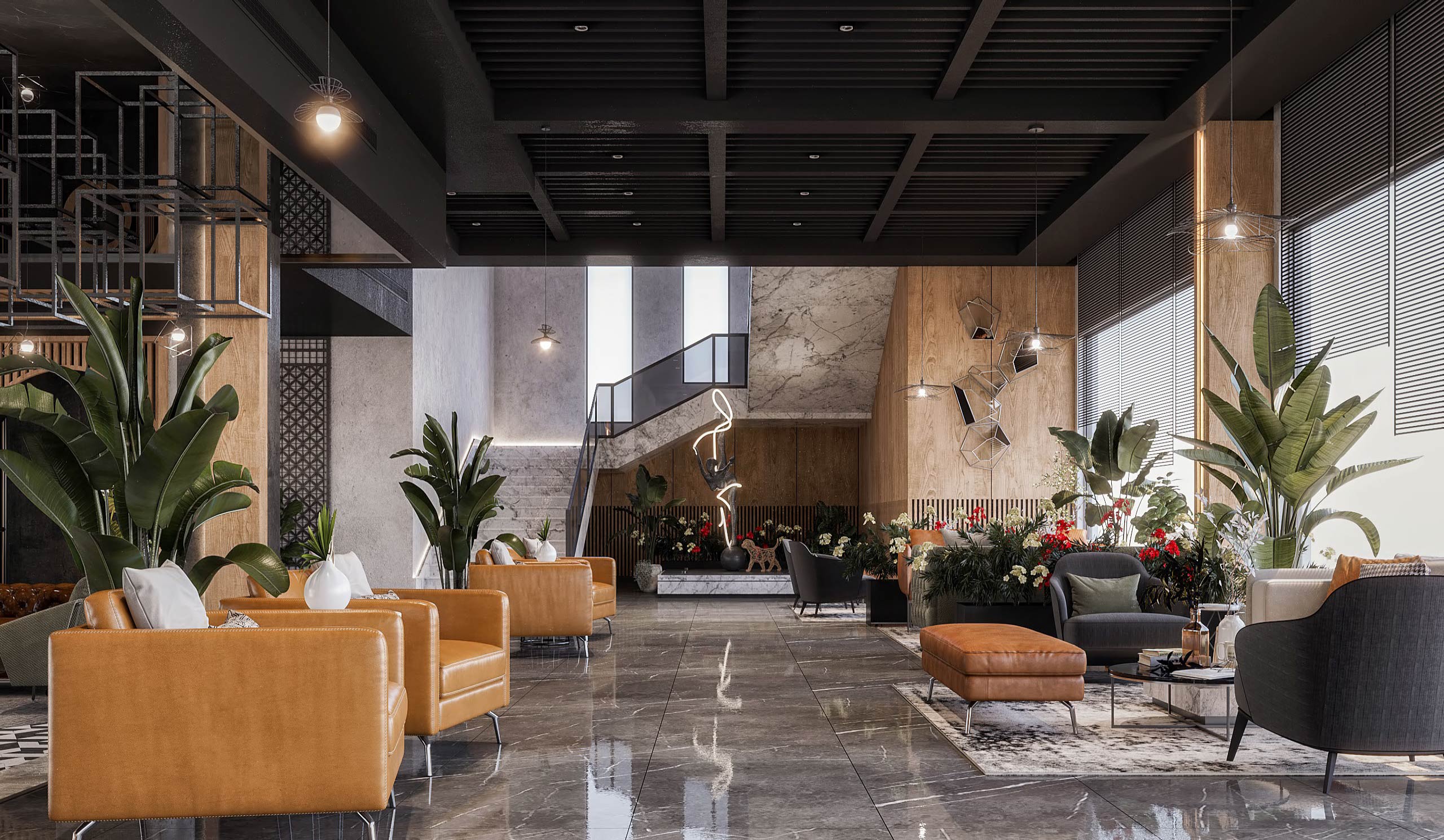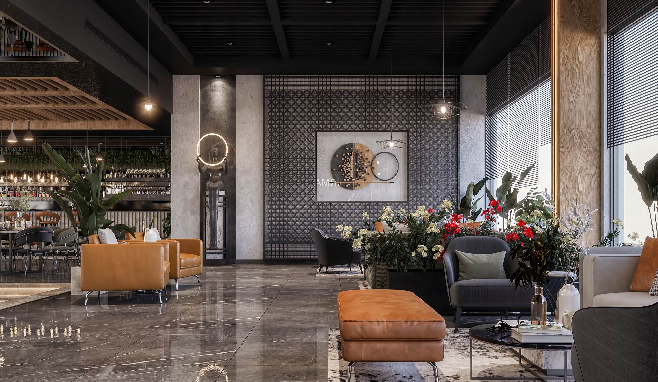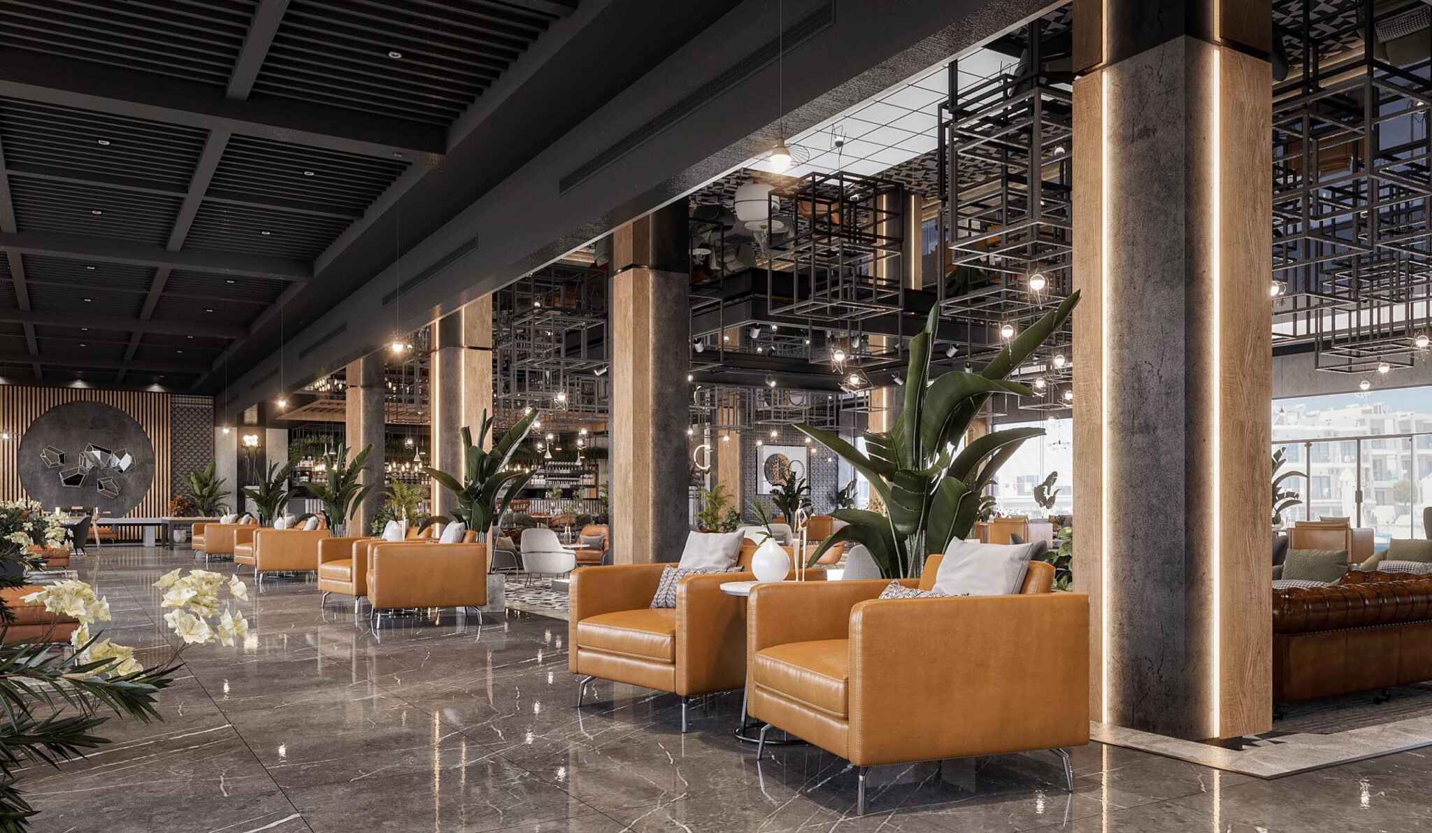 launge Total Area: 1320 m2 launge Zia Company has the credit for designing a stylish hotel lounge that seamlessly blends contemporary design with comfort. The space features elegant furnishings and ambient lighting, offering guests a relaxed and inviting environment. Total Area: 1320 m2
