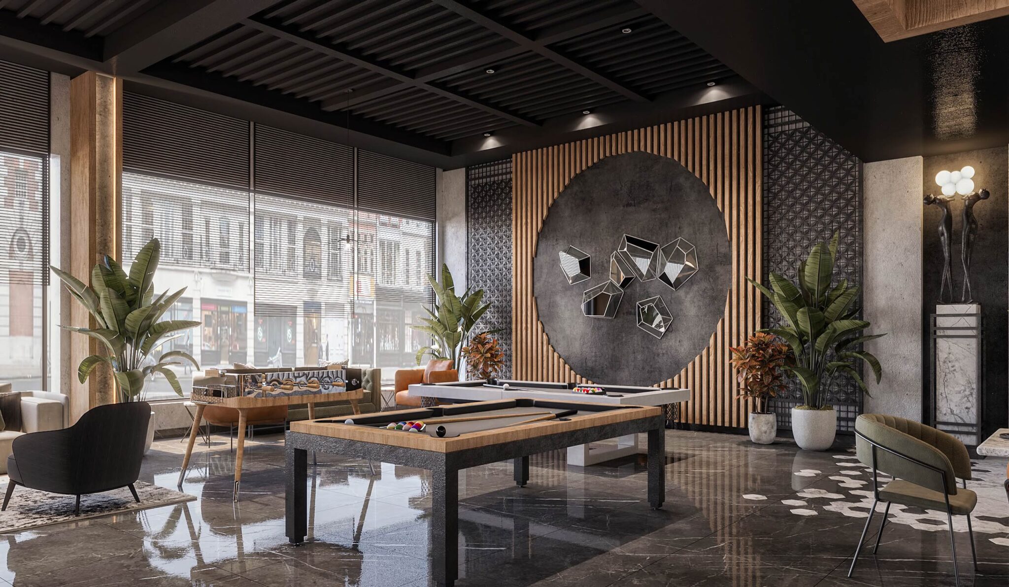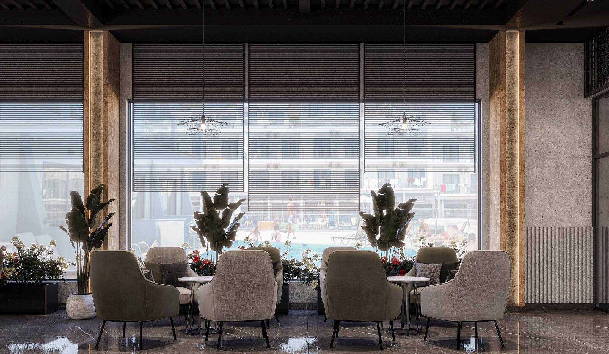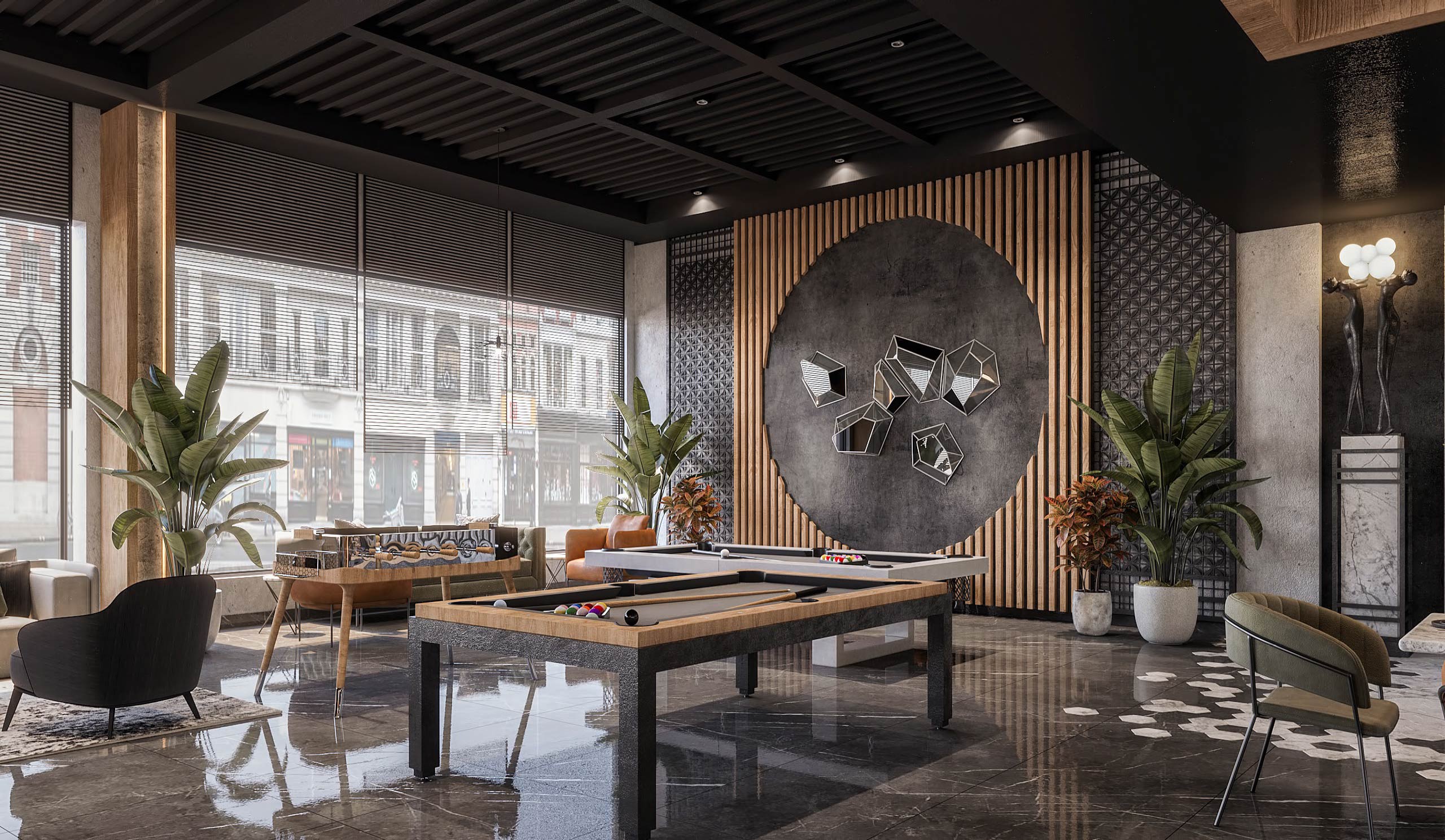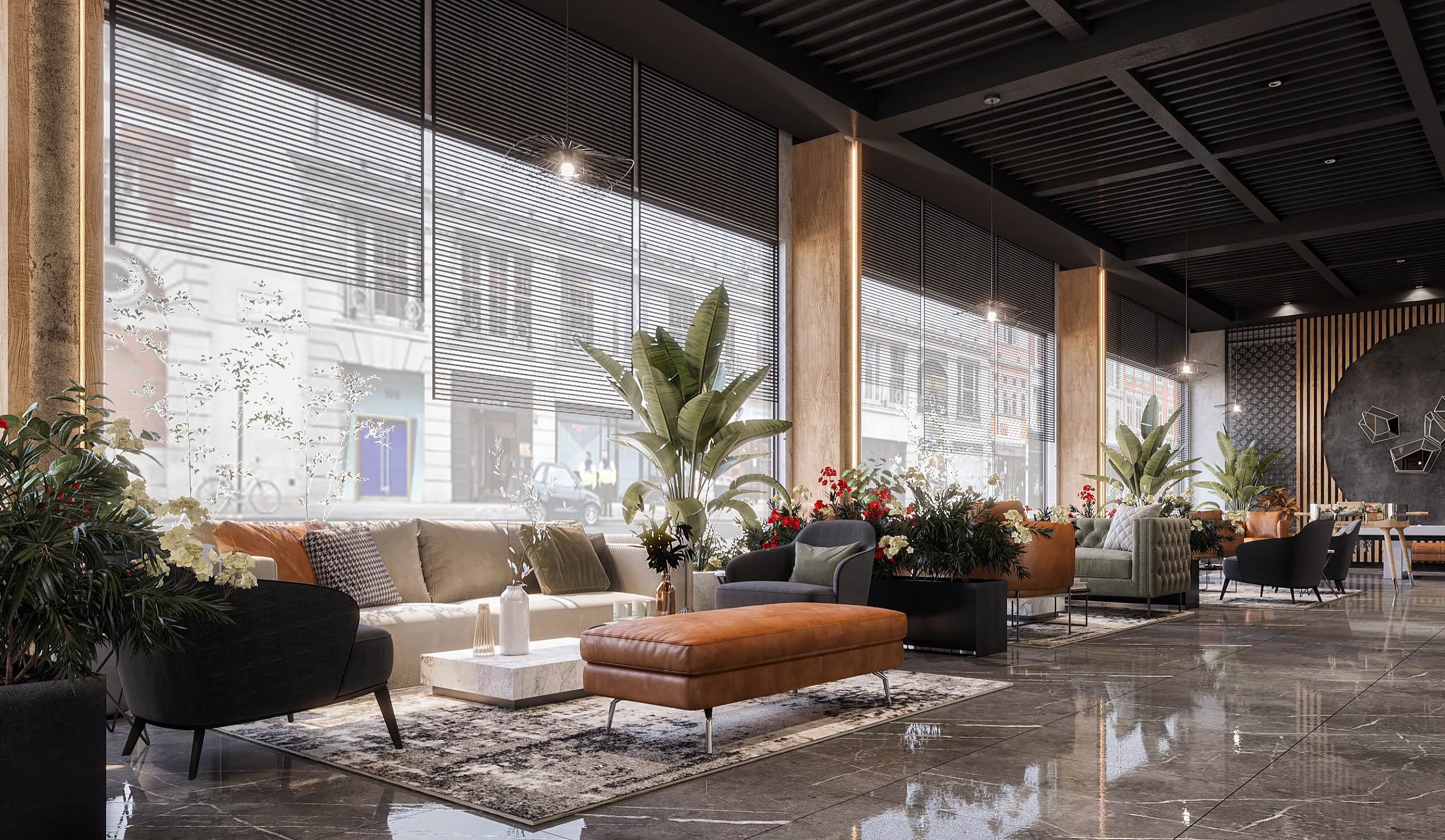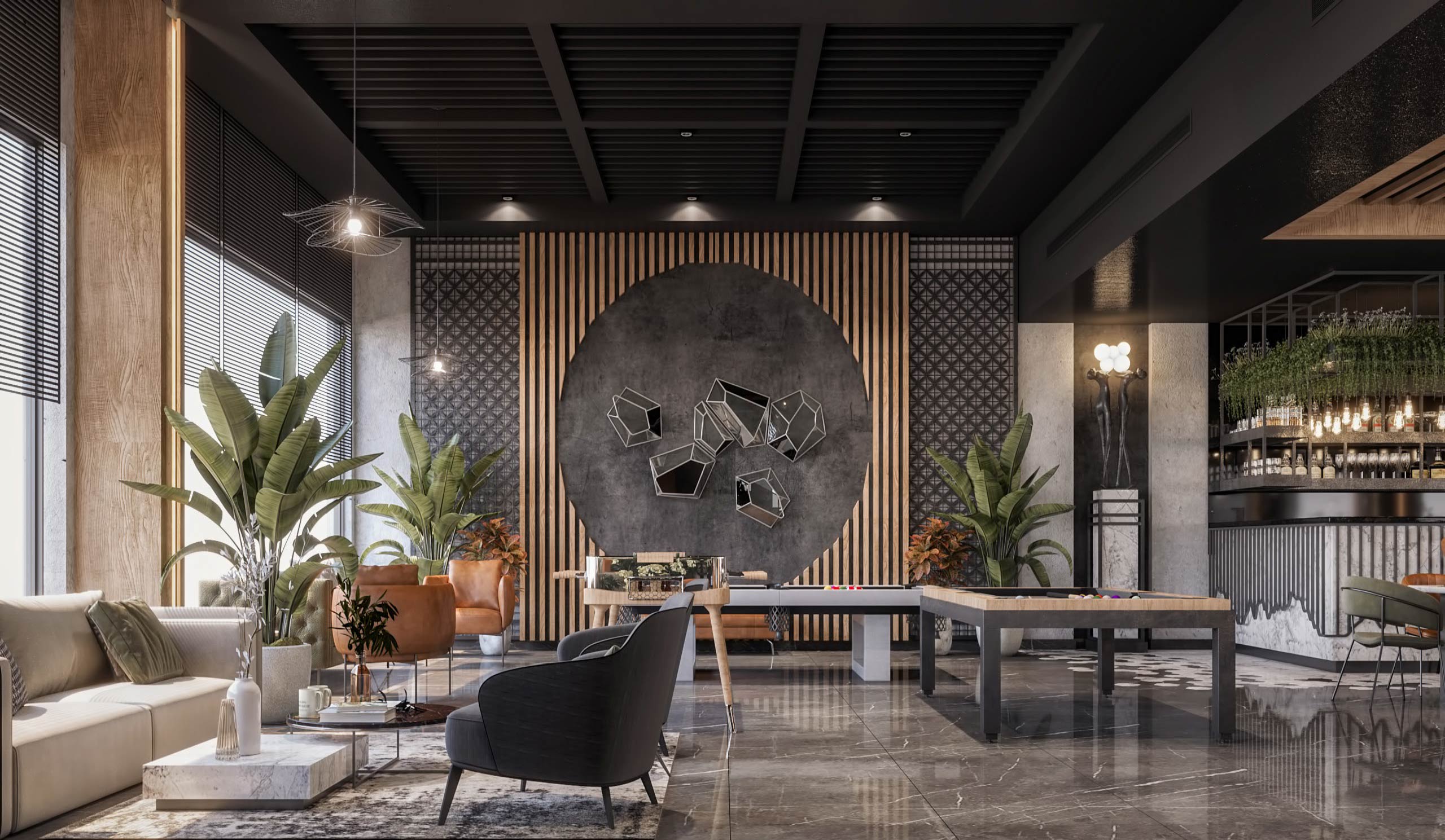 launge Total Area: 1320 m2 launge Zia Company has the credit for designing a stylish hotel lounge that seamlessly blends contemporary design with comfort. The space features elegant furnishings and ambient lighting, offering guests a relaxed and inviting environment. Total Area: 1320 m2