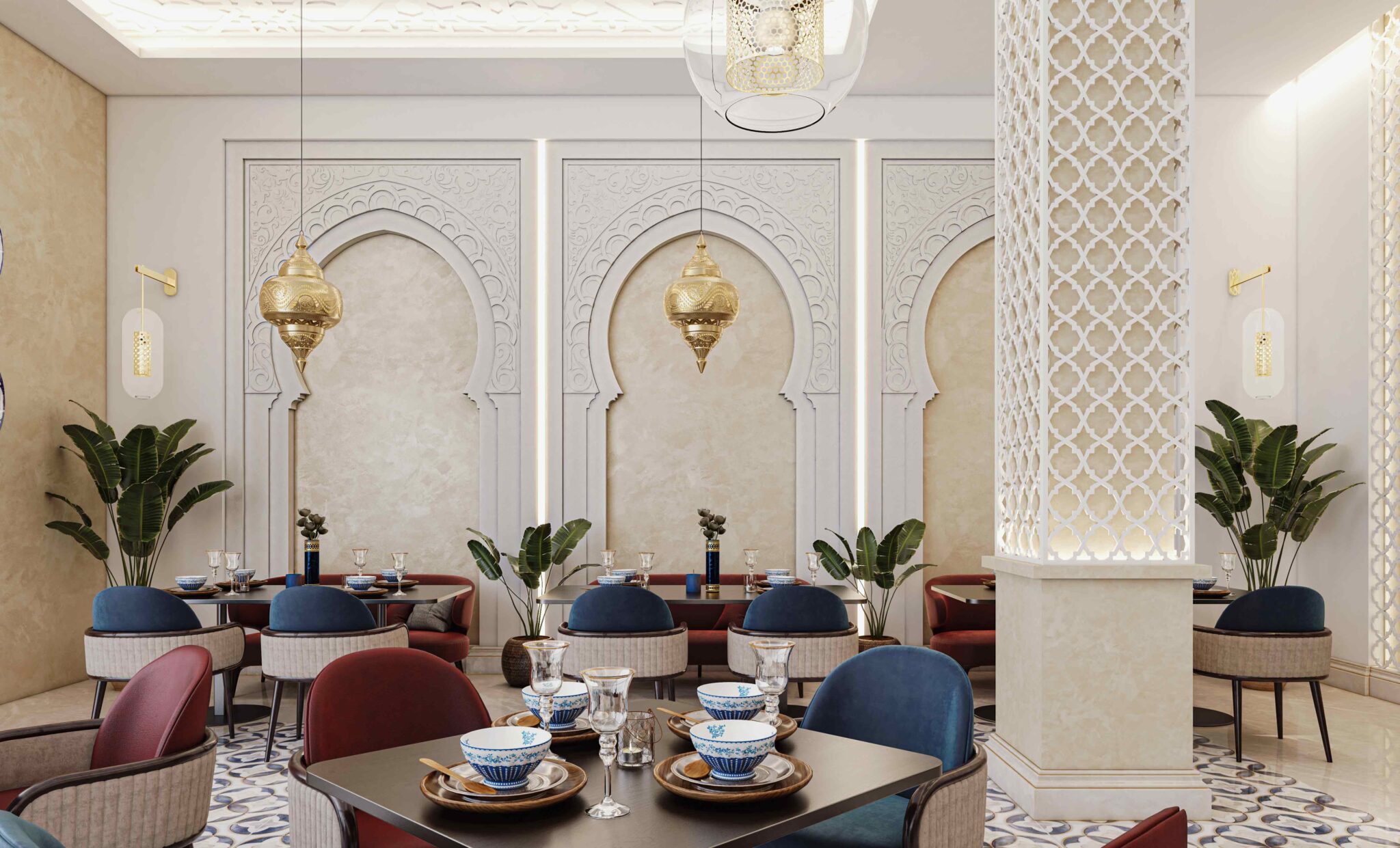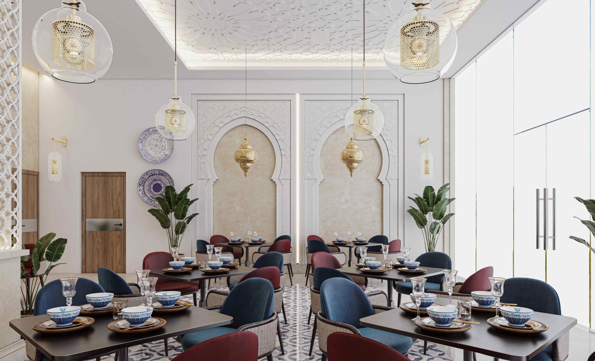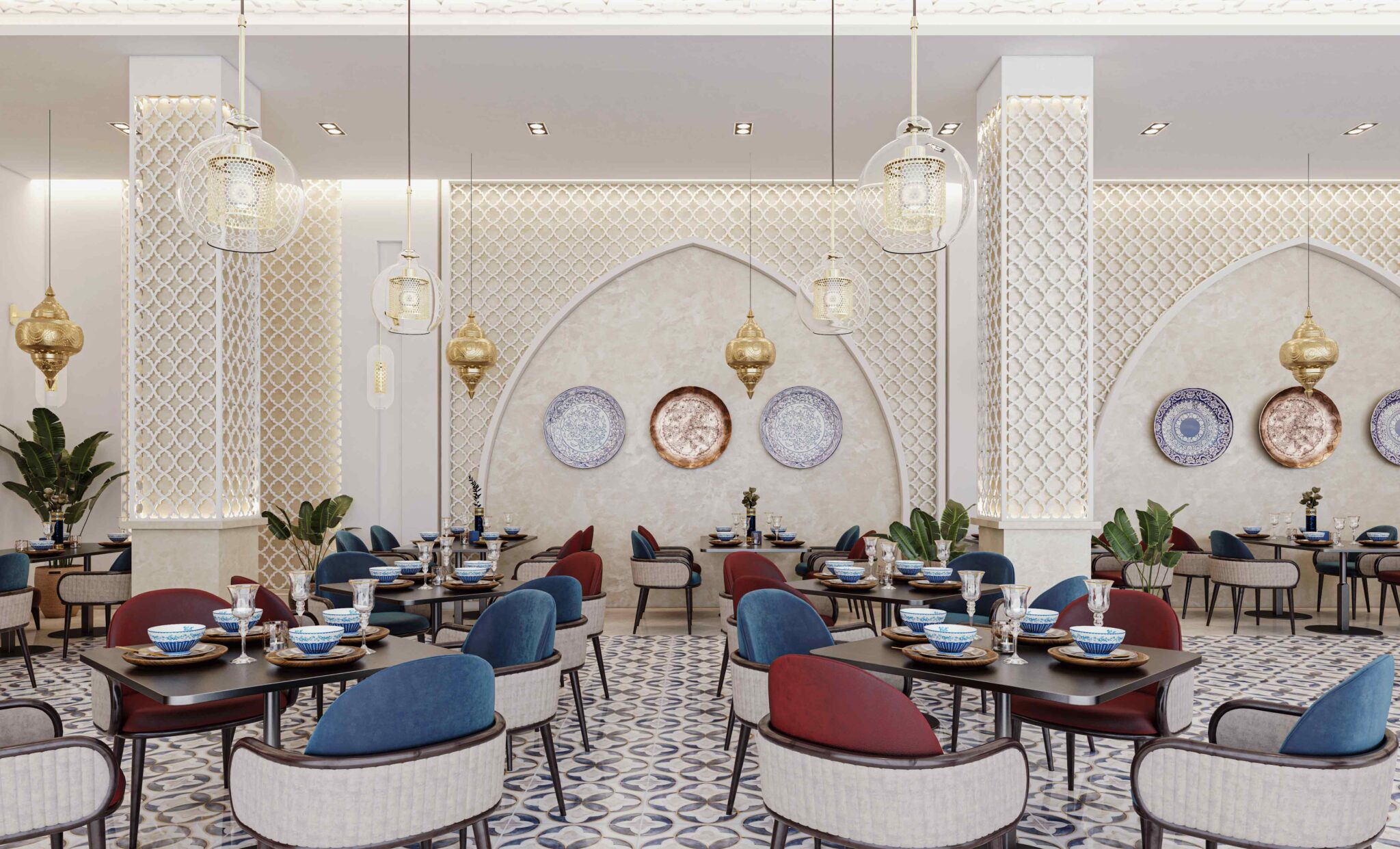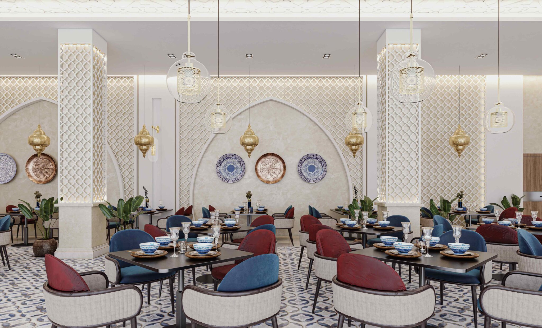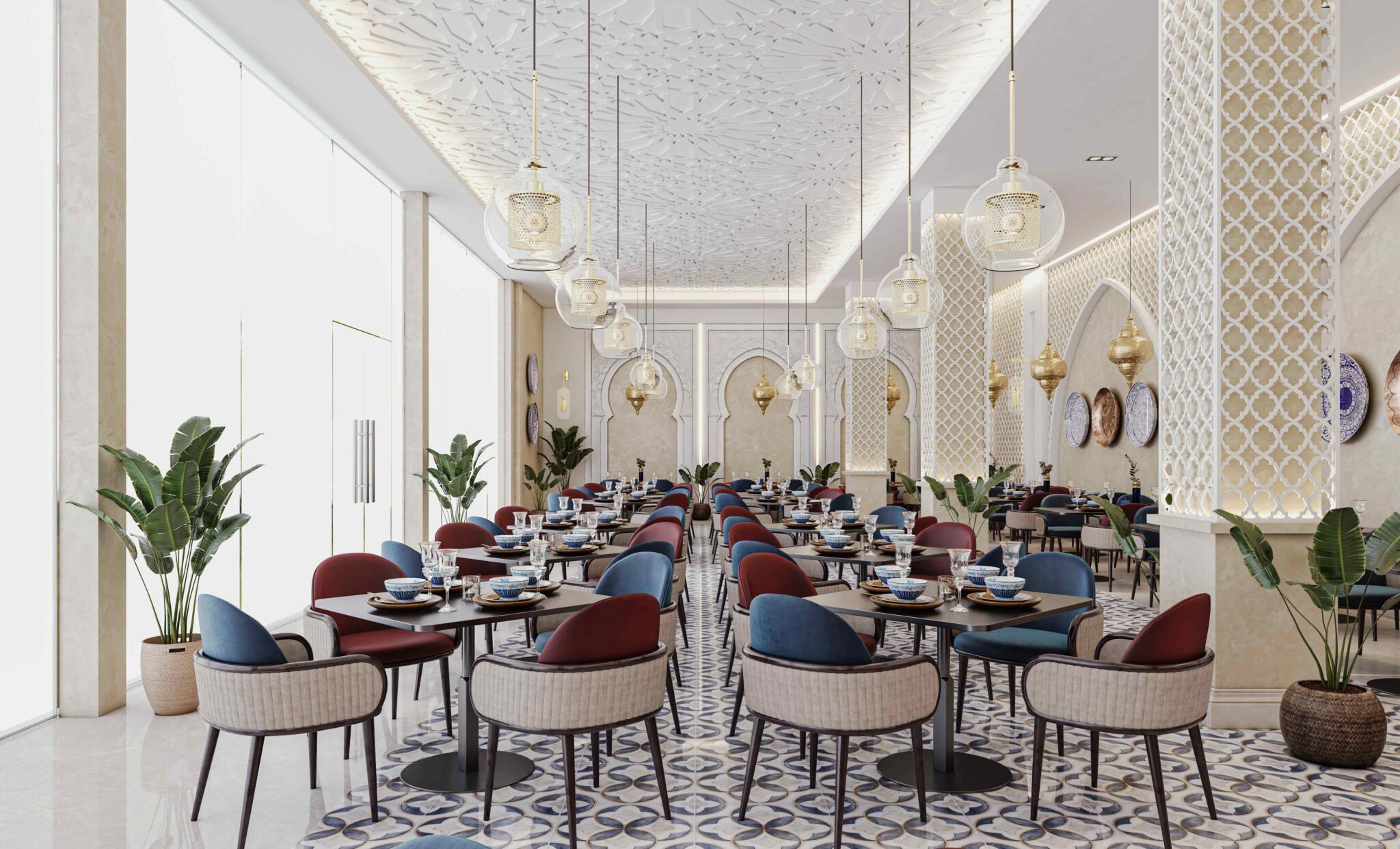 Zia Company has the credit for designing this Moroccan restaurant, resulting in an elegant and authentic dining space where traditional Moroccan elements meet modern comfort, creating a warm and inviting atmosphere for guests.
