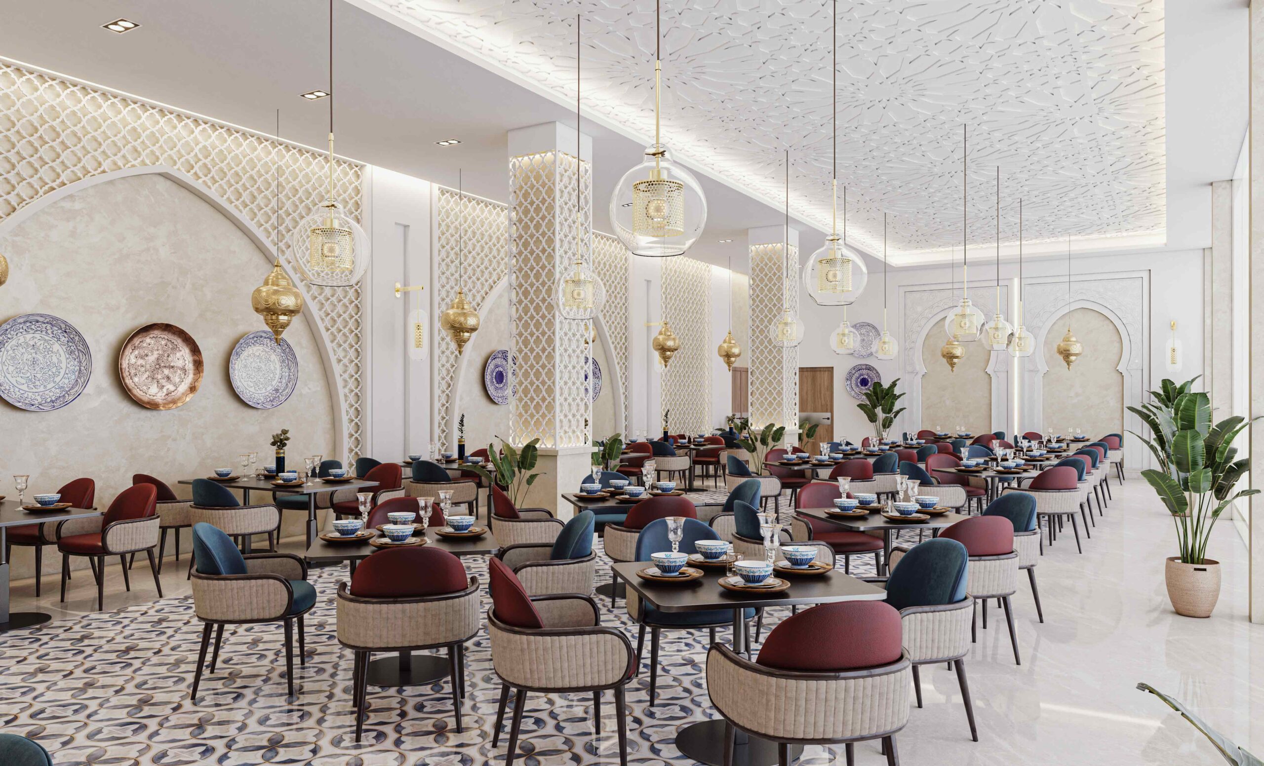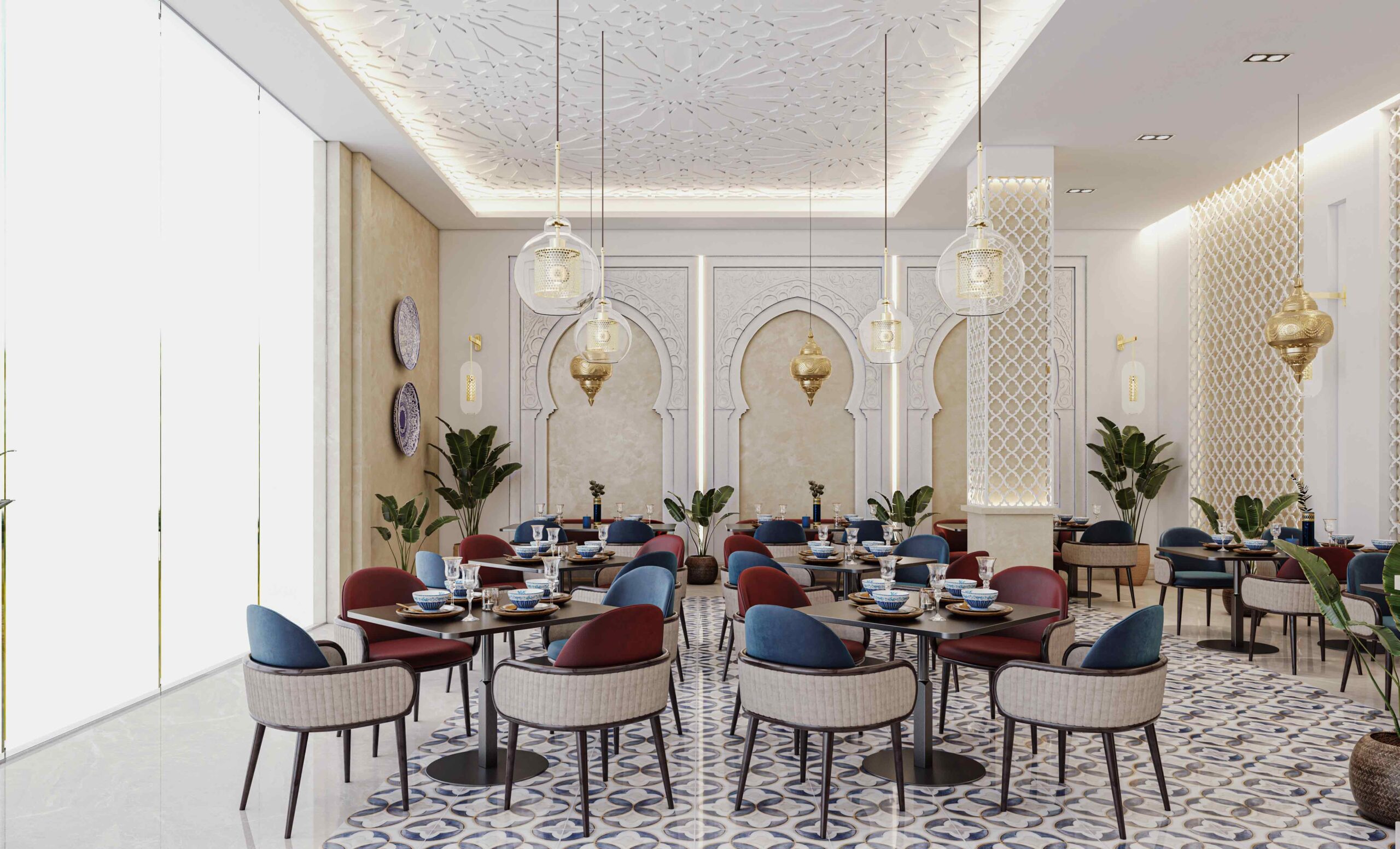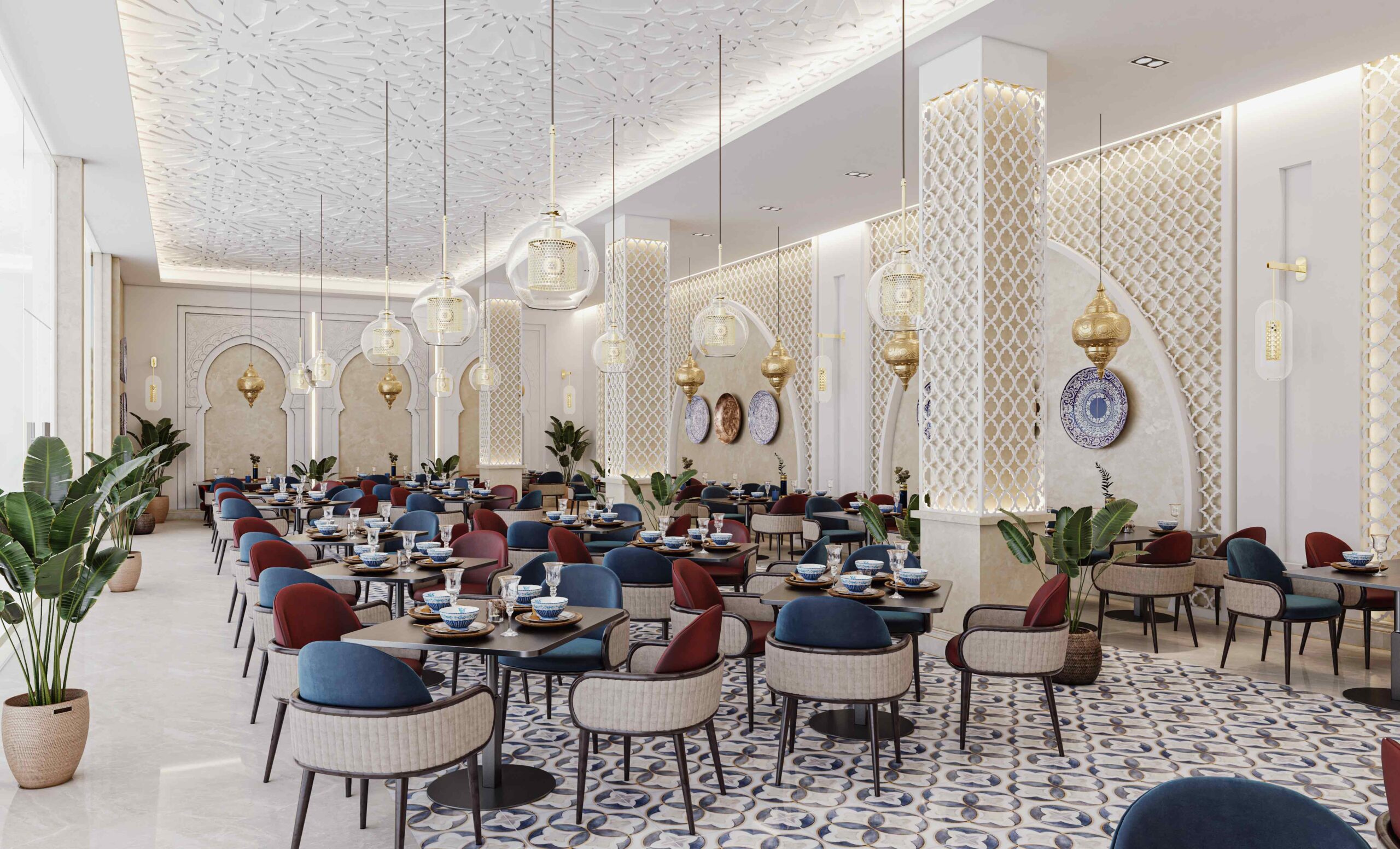 Zia Company has the credit for designing this Moroccan restaurant, resulting in an elegant and authentic dining space where traditional Moroccan elements meet modern comfort, creating a warm and inviting atmosphere for guests.