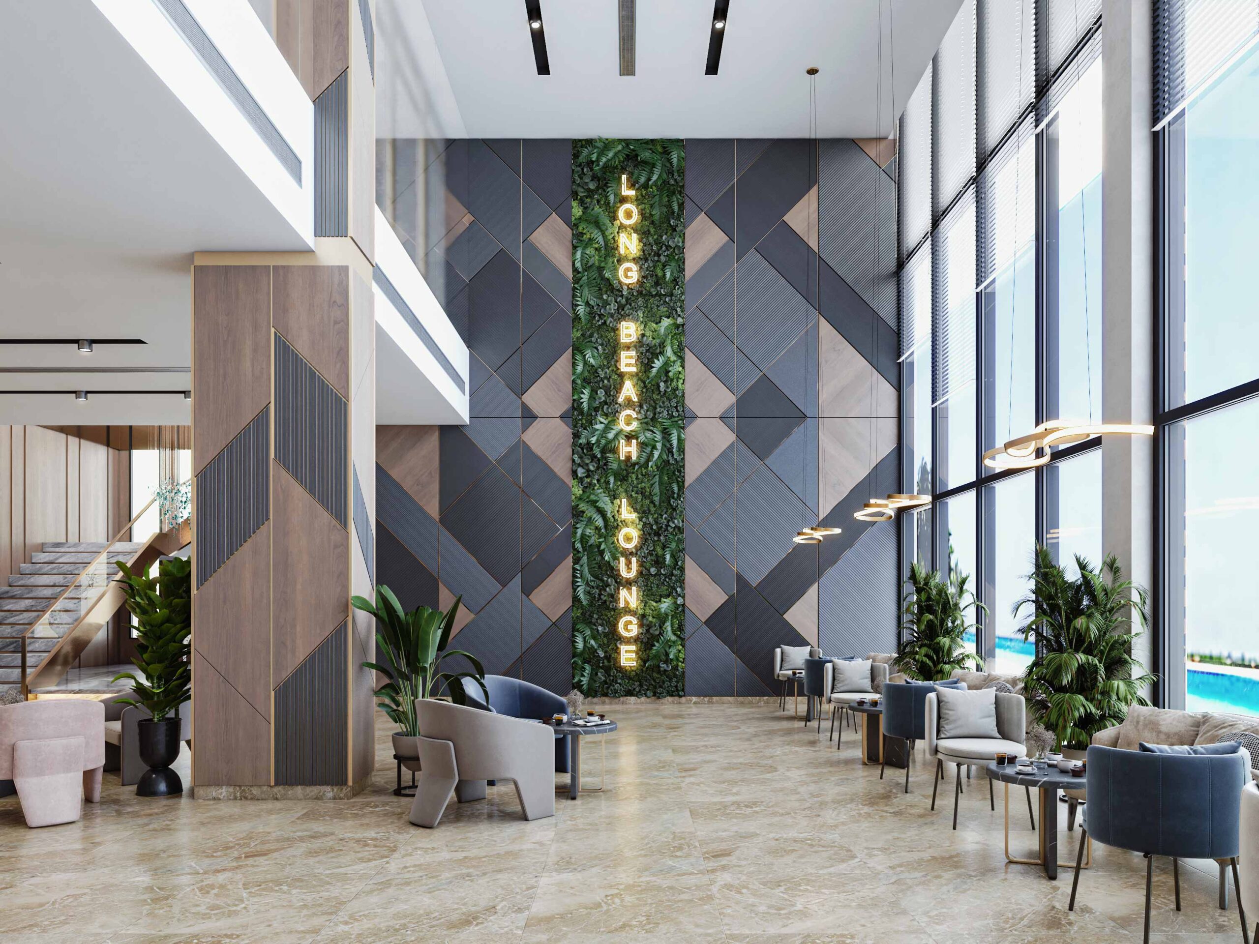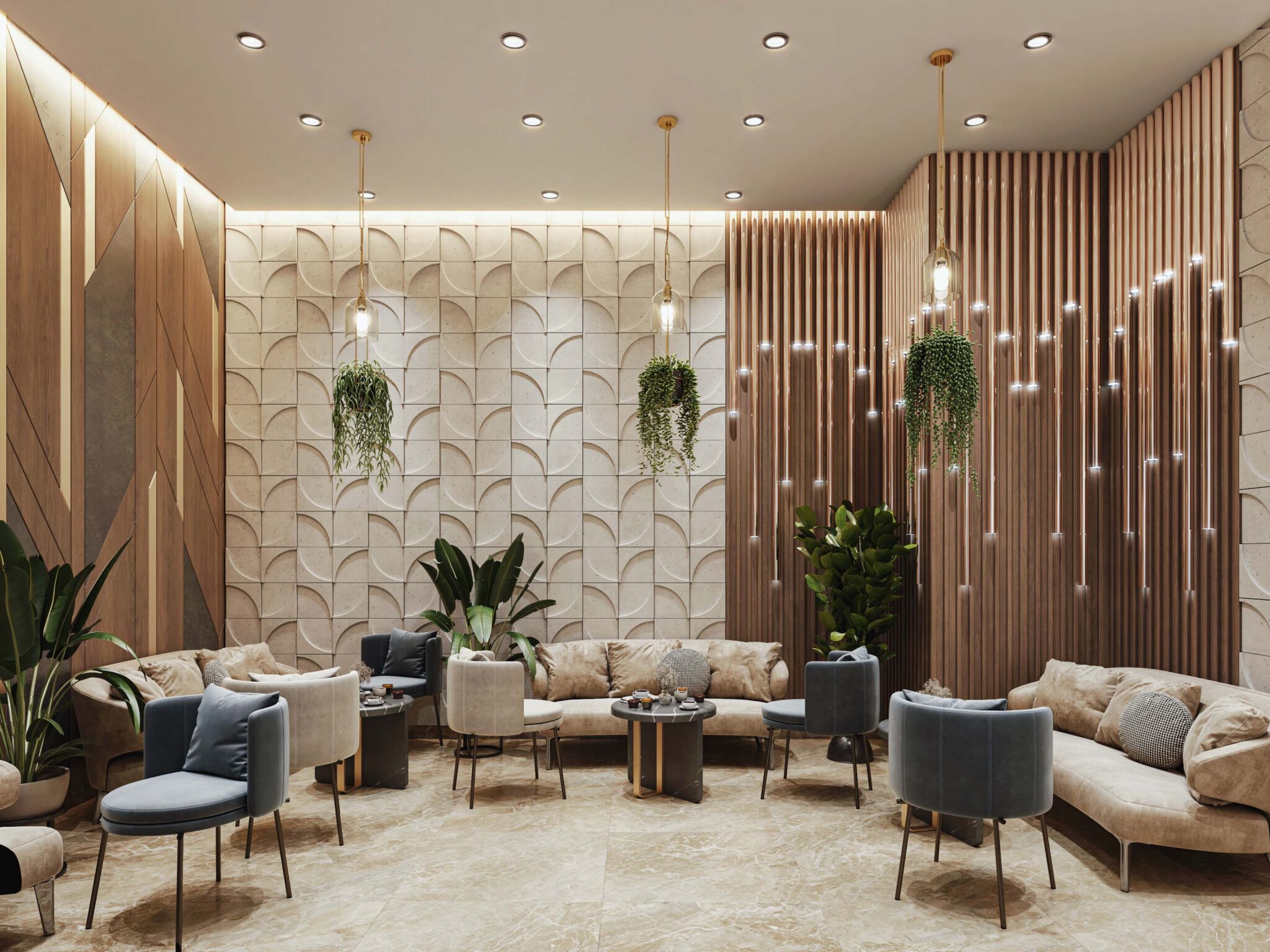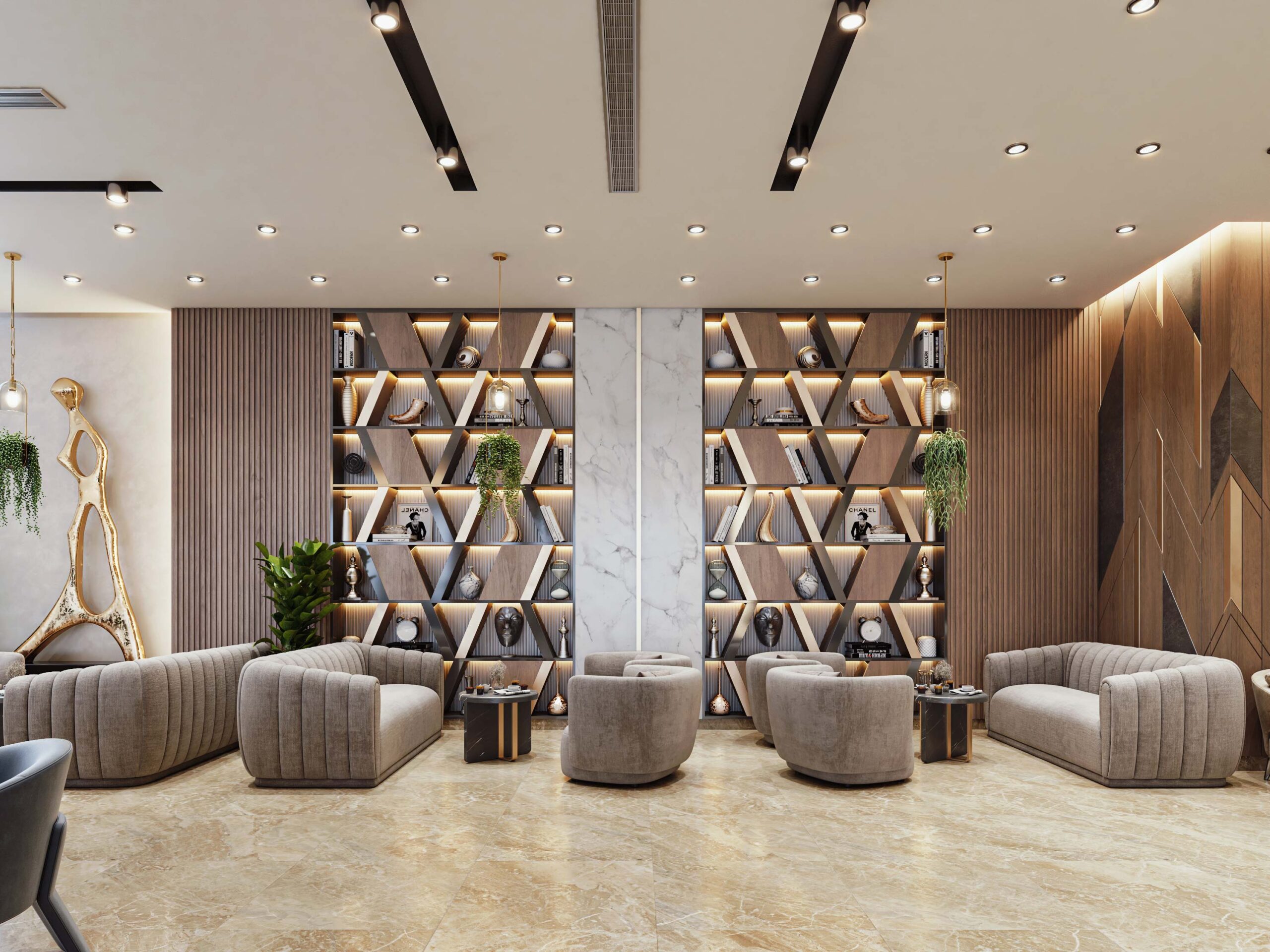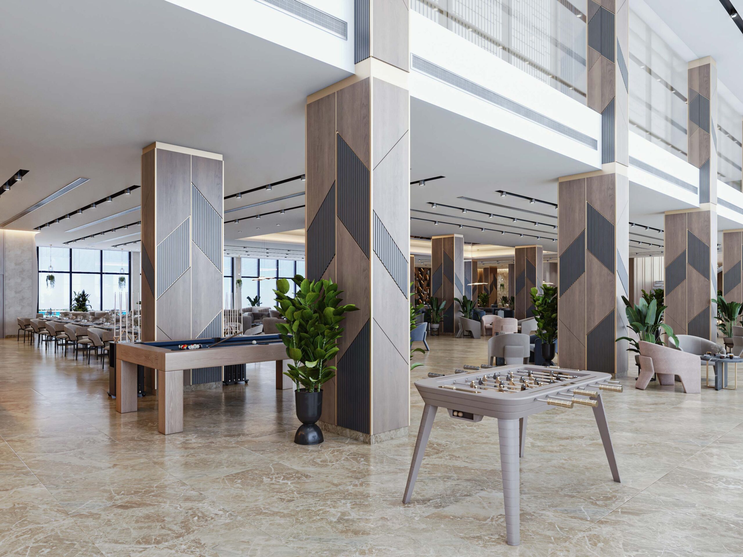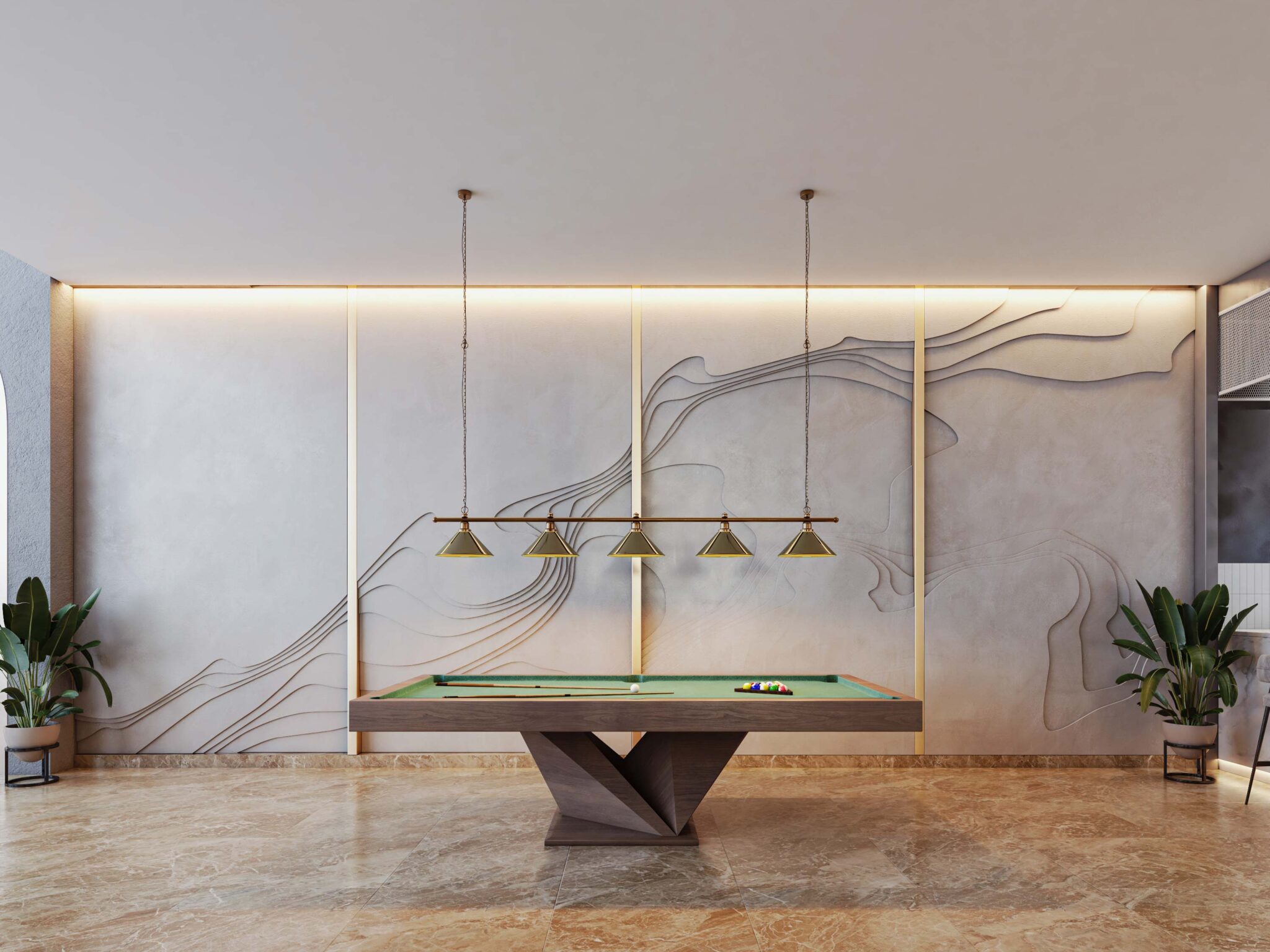 Zia company has the credit for designing this modern lounge, thoughtfully incorporating a stylish bar and a dedicated billiard area for guests. This space seamlessly blends contemporary design with leisure, offering an inviting atmosphere for socializing and relaxation.