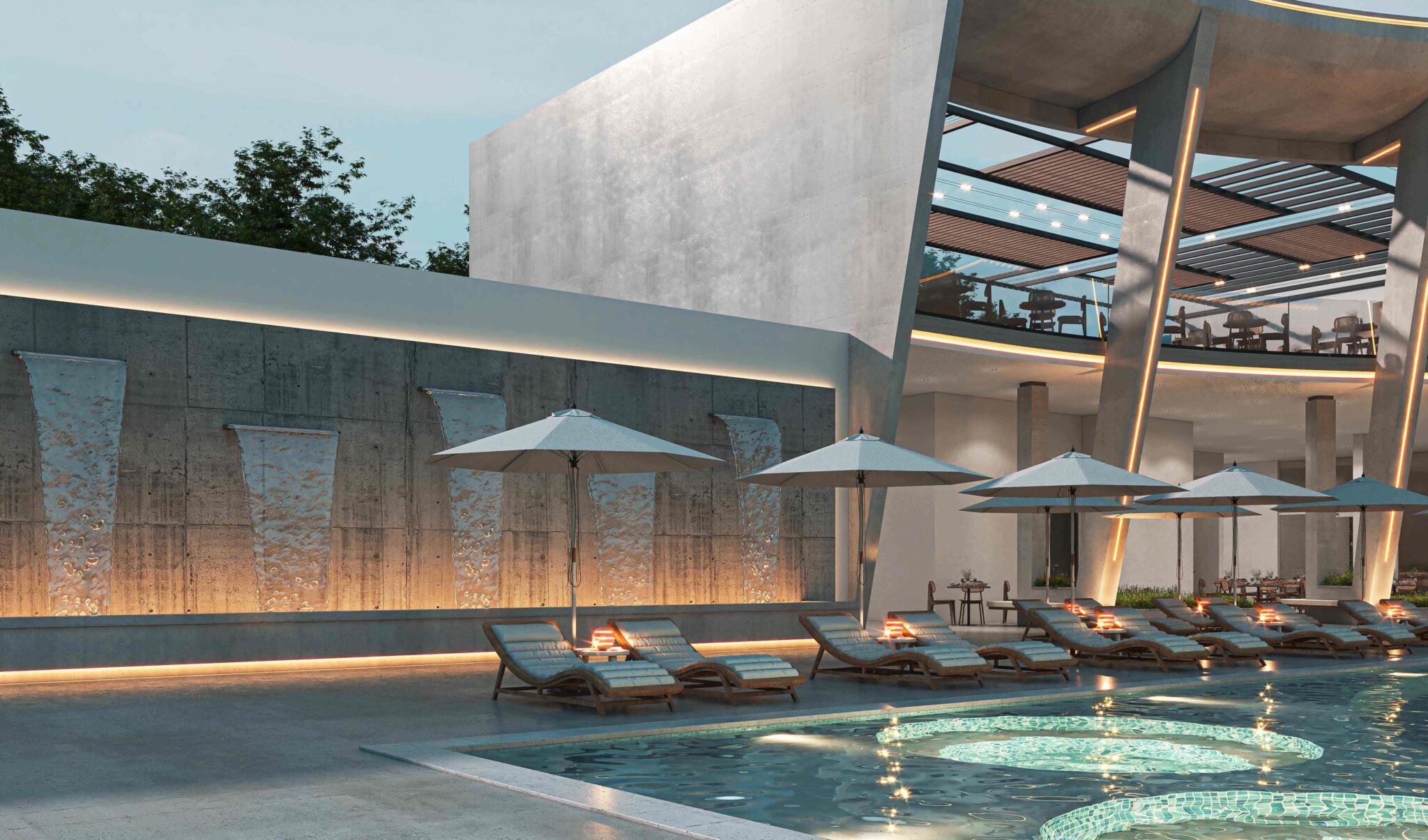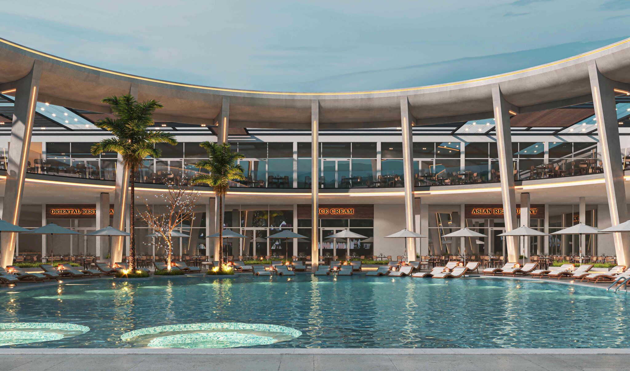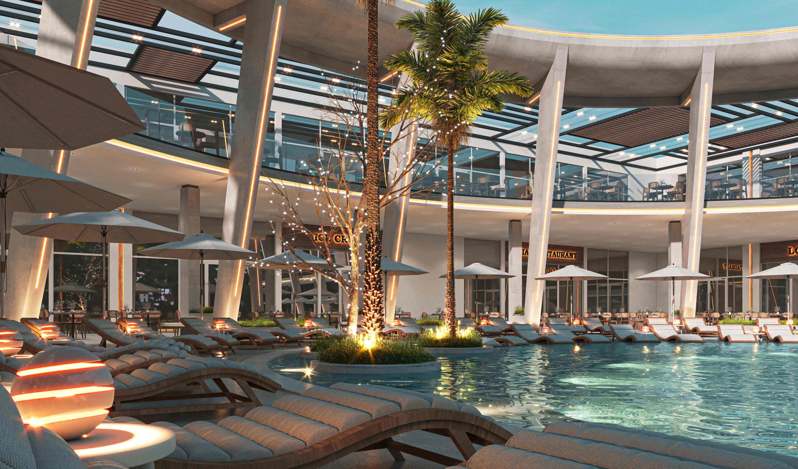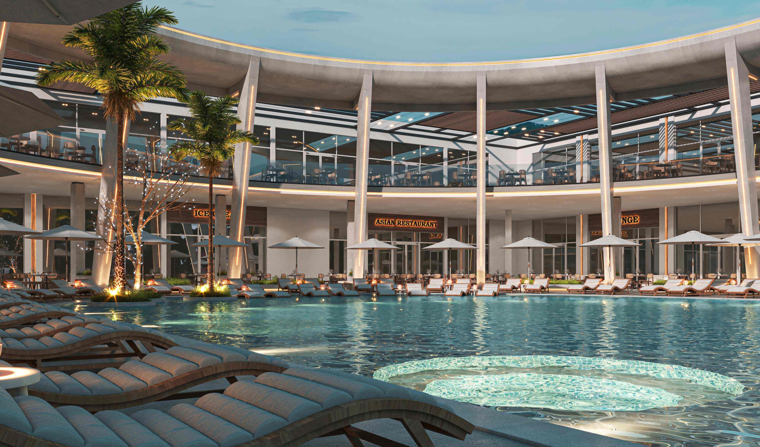 Zia Company has the credit for designing “THE POINT” complex within Long Beach Hotel, which seamlessly blends modern aesthetics with luxurious amenities, featuring a chic lounge and a selection of diverse dining experiences, including a Moroccan restaurant, an Asian restaurant, and an Italian restaurant, alongside a vibrant café and ice cream bar. The space promotes a serene ambience with tranquil waterfalls, inviting pools, and a relaxing jacuzzi. Thoughtfully designed for smooth circulation, it incorporates lush greenery and various materials, creating a harmonious environment that invites guests to unwind and indulge in an unparalleled experience.