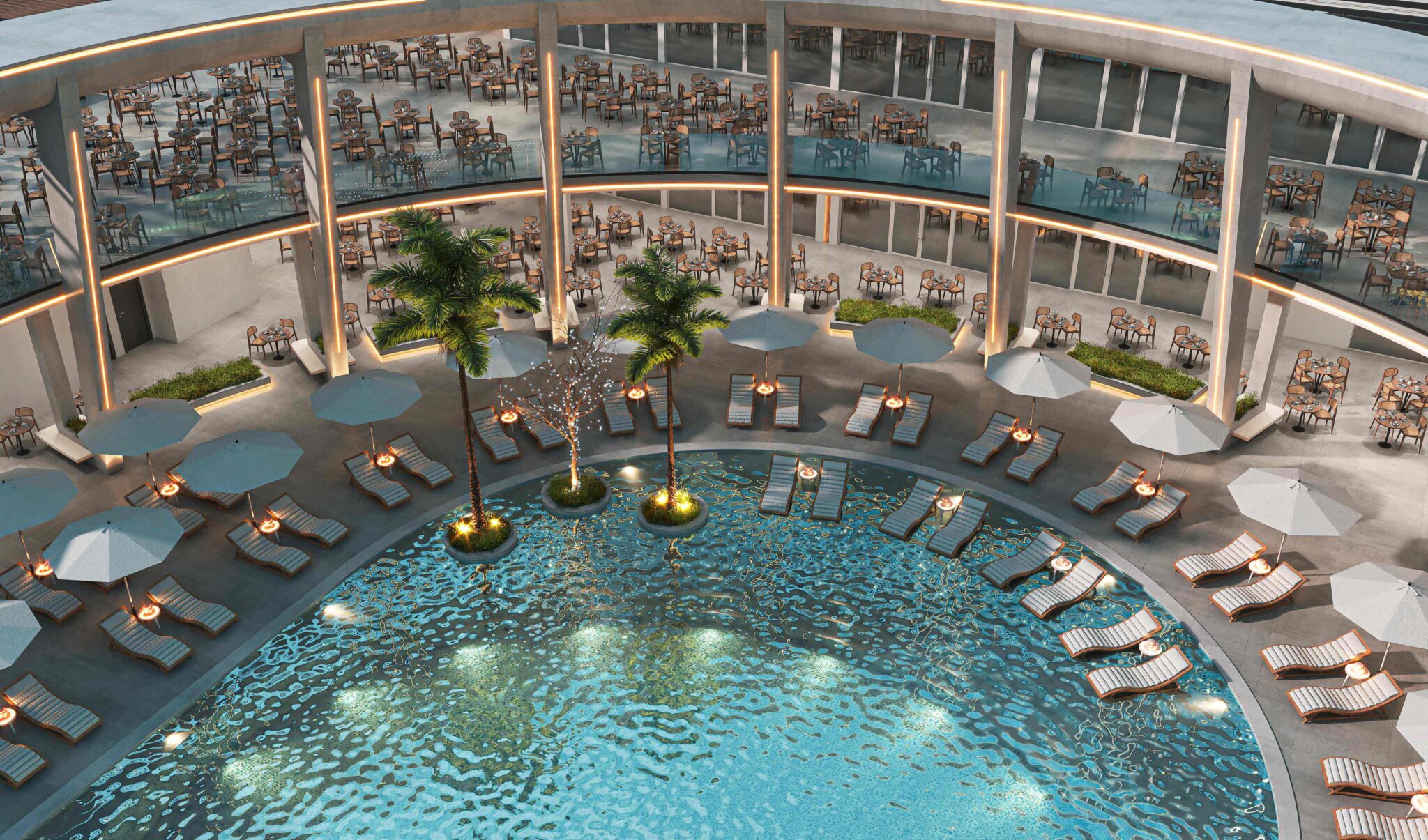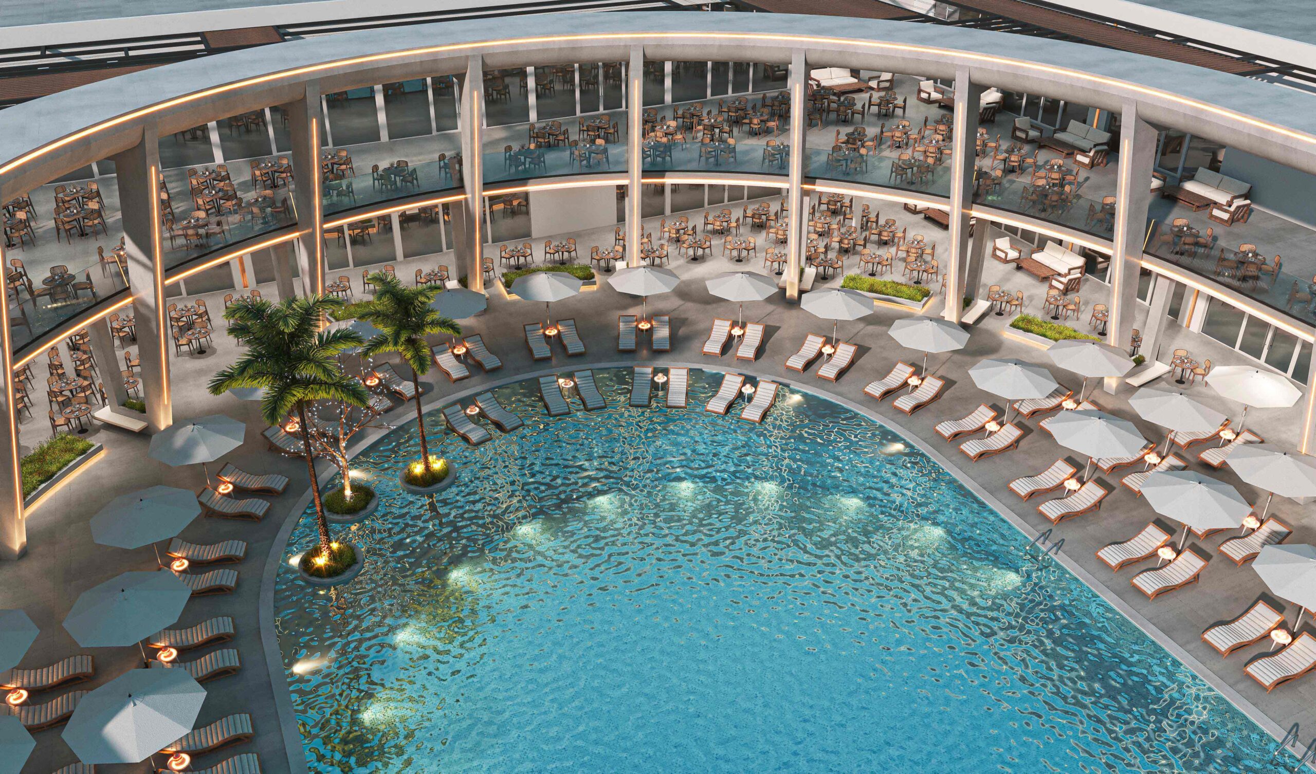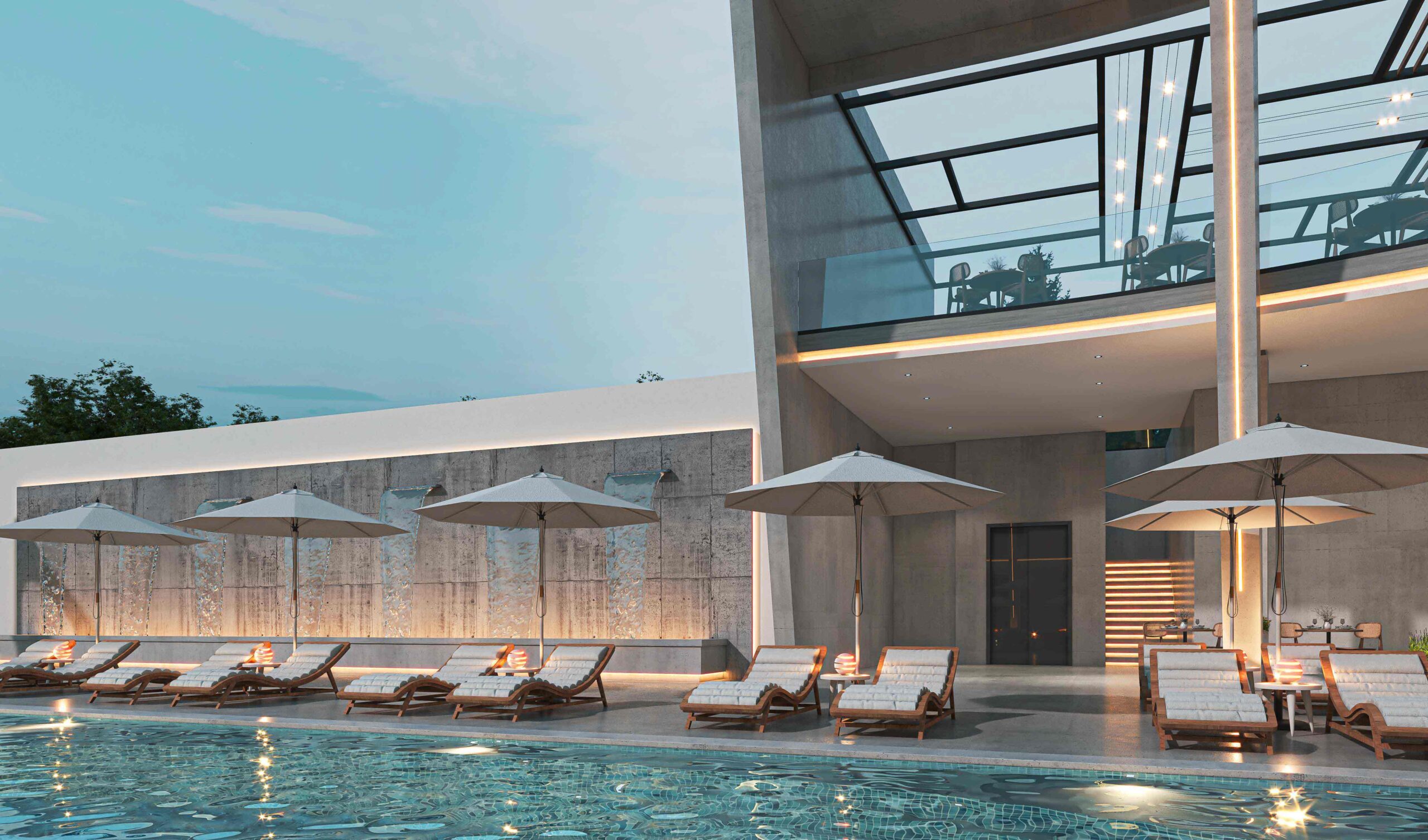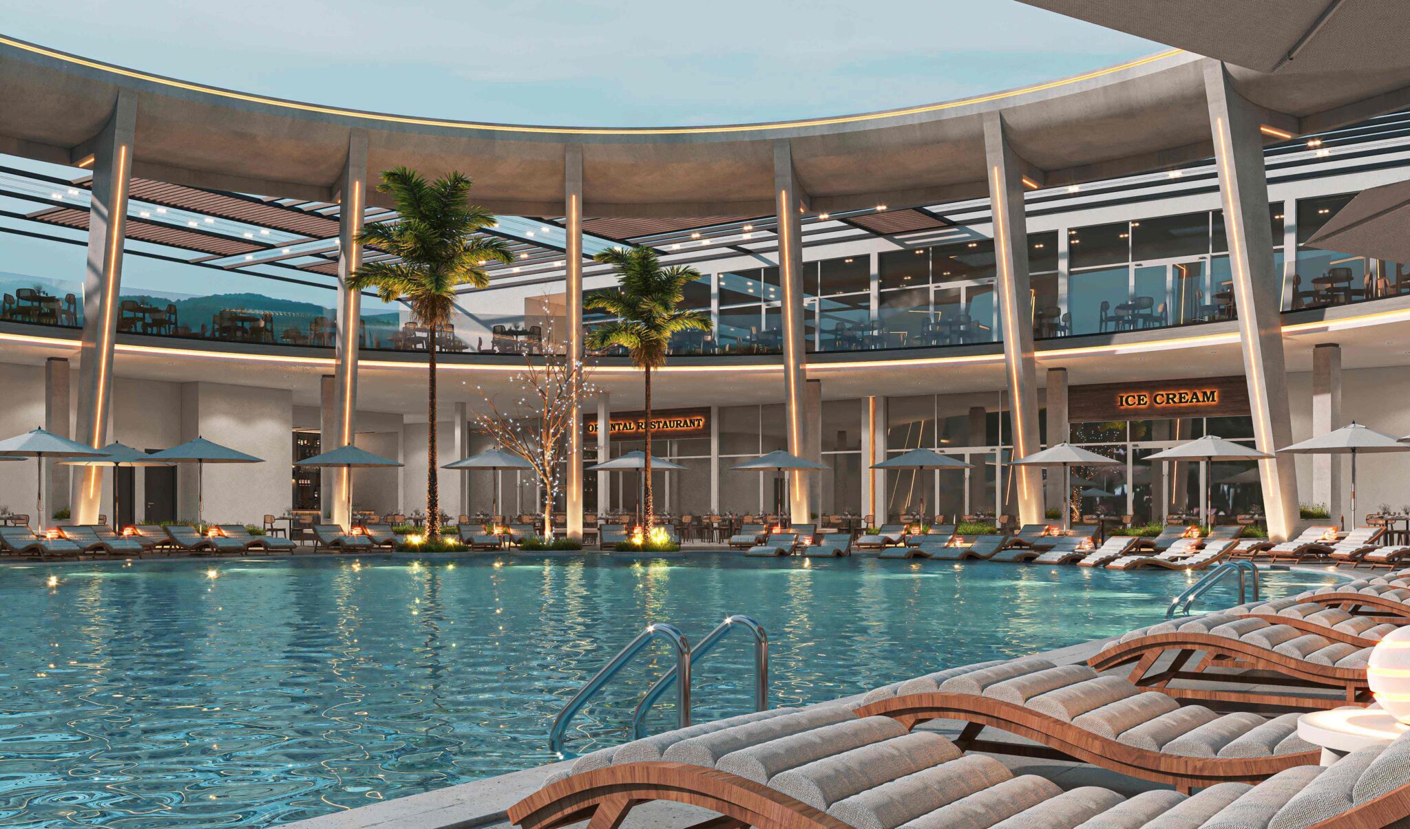 Zia Company has the credit for designing “THE POINT” complex within Long Beach Hotel, which seamlessly blends modern aesthetics with luxurious amenities, featuring a chic lounge and a selection of diverse dining experiences, including a Moroccan restaurant, an Asian restaurant, and an Italian restaurant, alongside a vibrant café and ice cream bar. The space promotes a serene ambience with tranquil waterfalls, inviting pools, and a relaxing jacuzzi. Thoughtfully designed for smooth circulation, it incorporates lush greenery and various materials, creating a harmonious environment that invites guests to unwind and indulge in an unparalleled experience.