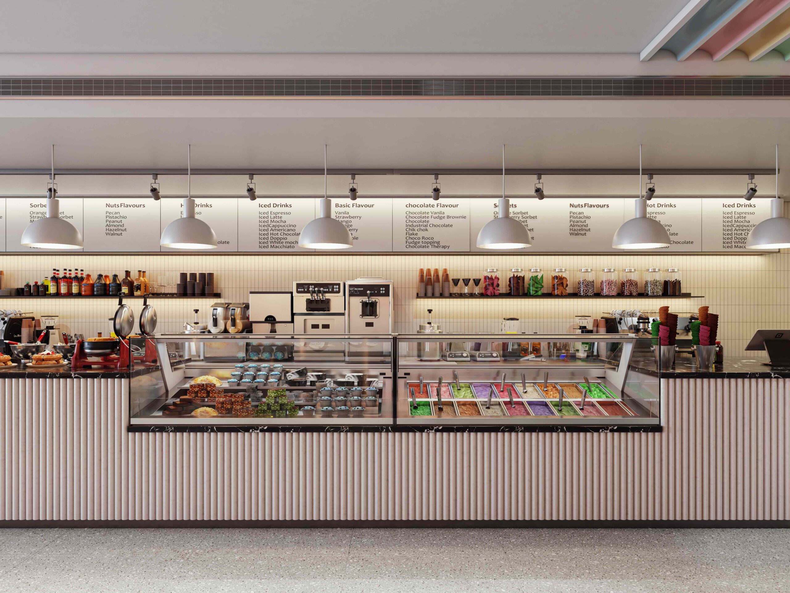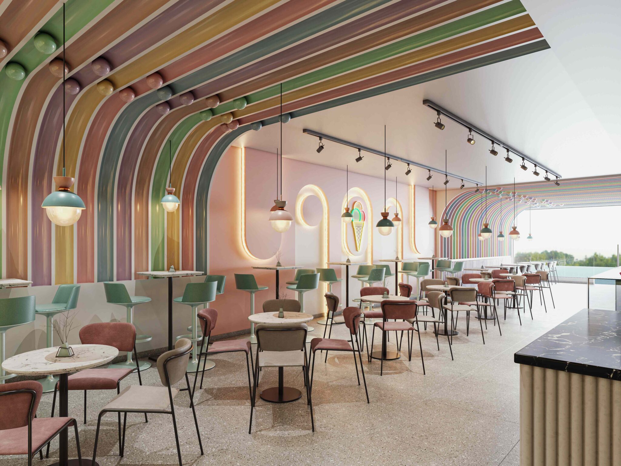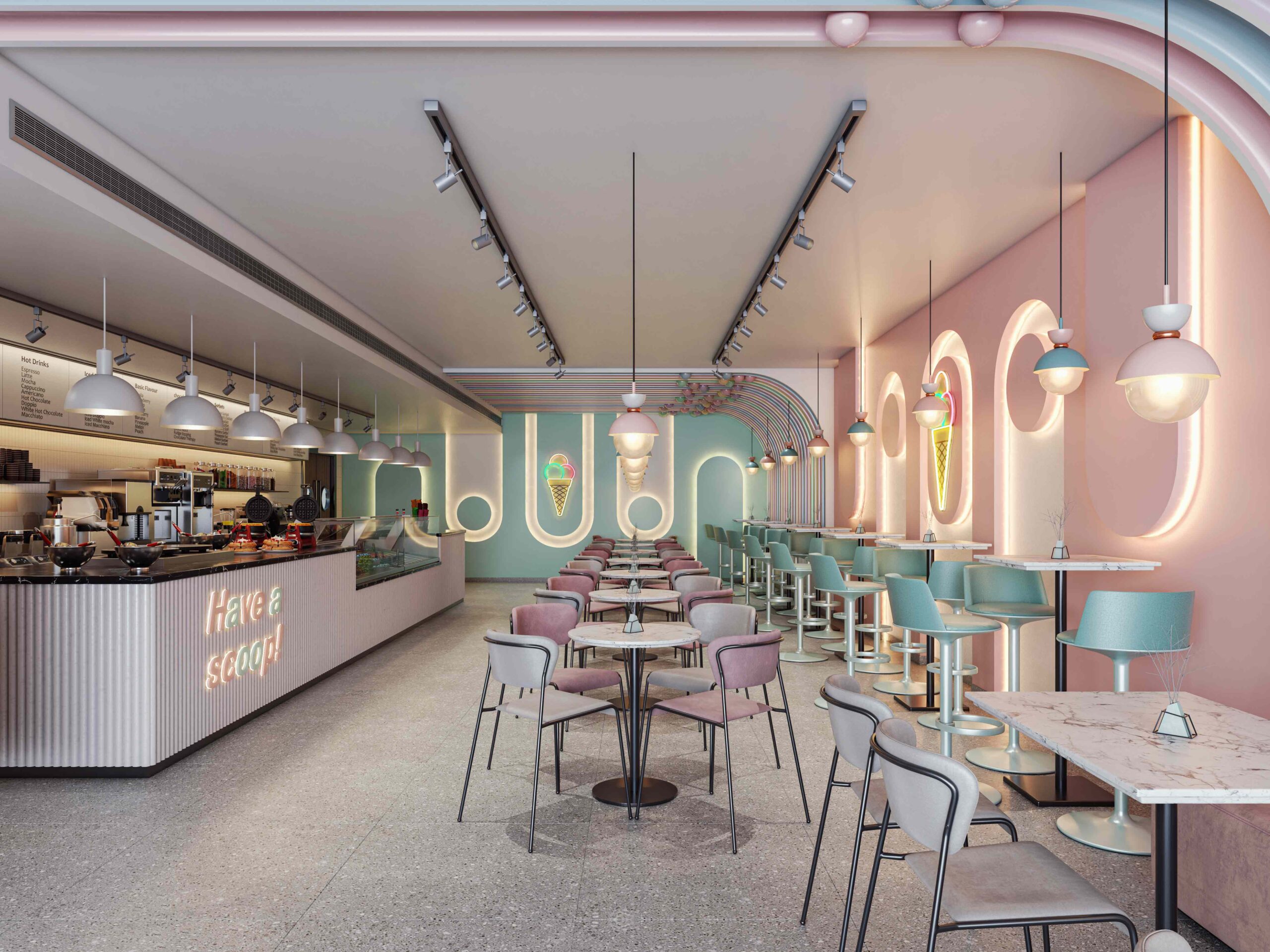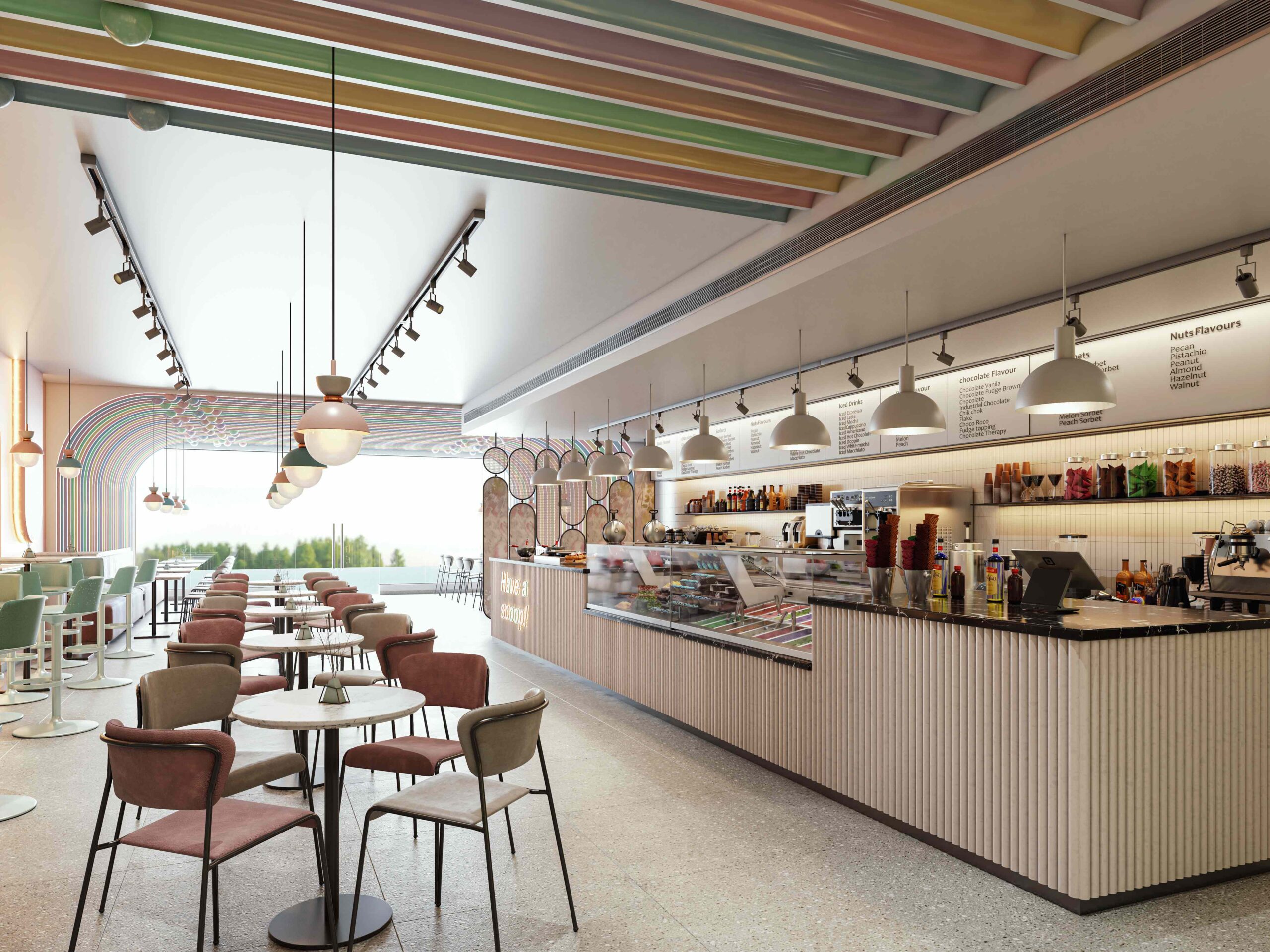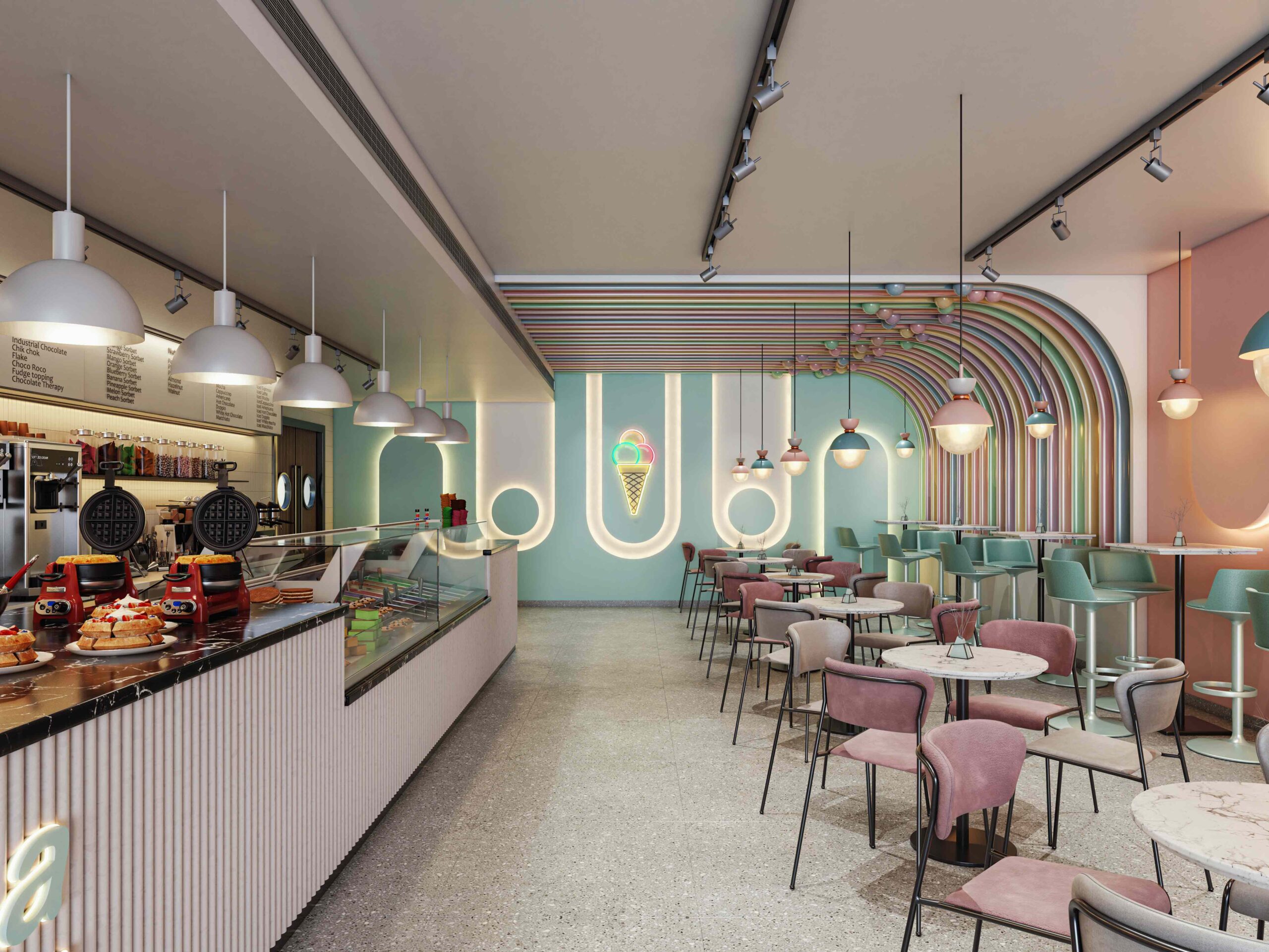 Zia company has the credit for designing the hotel’s ice cream bar, it is a vibrant, colorful space designed to celebrate the joy of ice cream. With a lively array of hues reflecting the many flavors available, the bar invites guests to indulge their sweet cravings in a playful atmosphere.