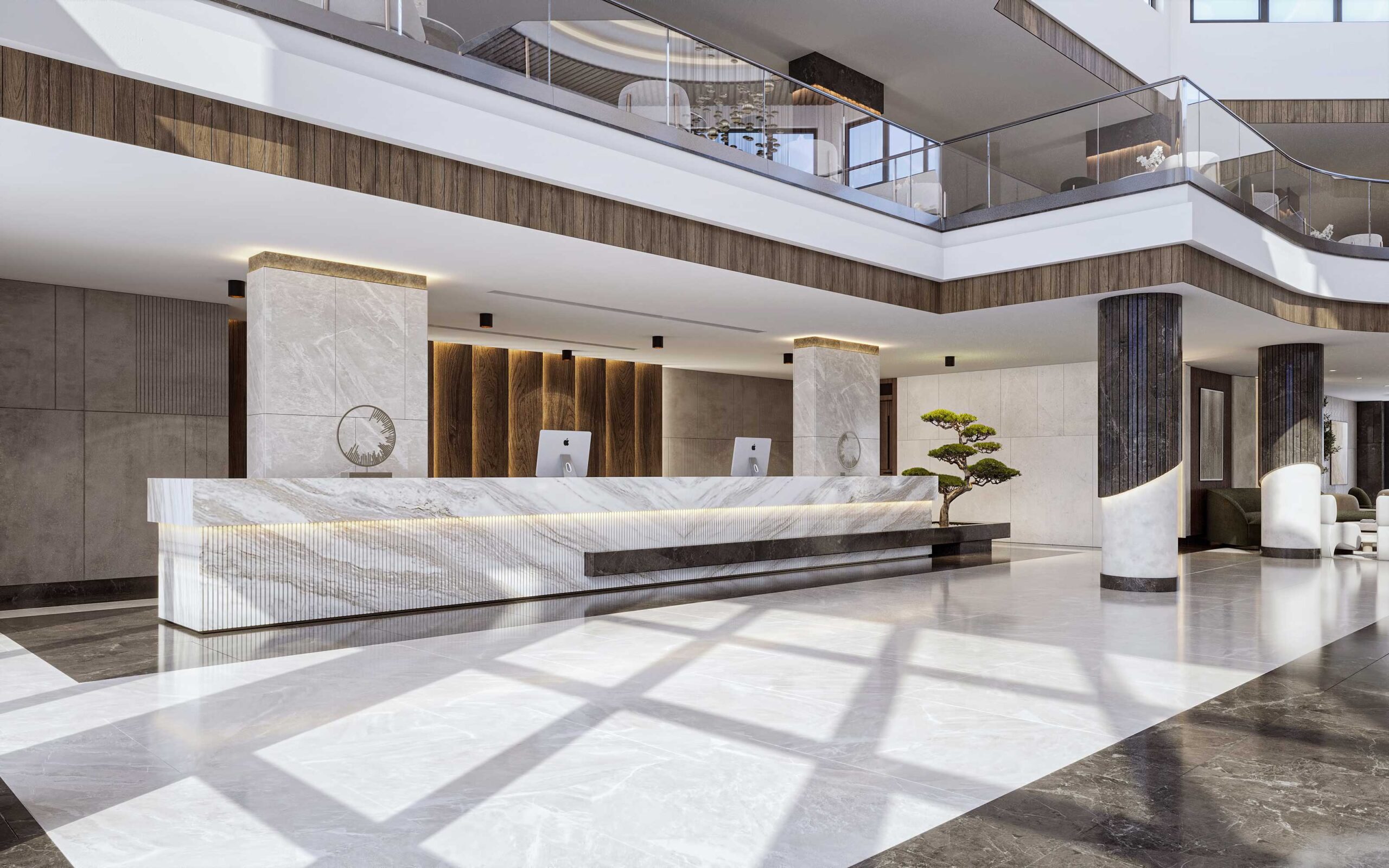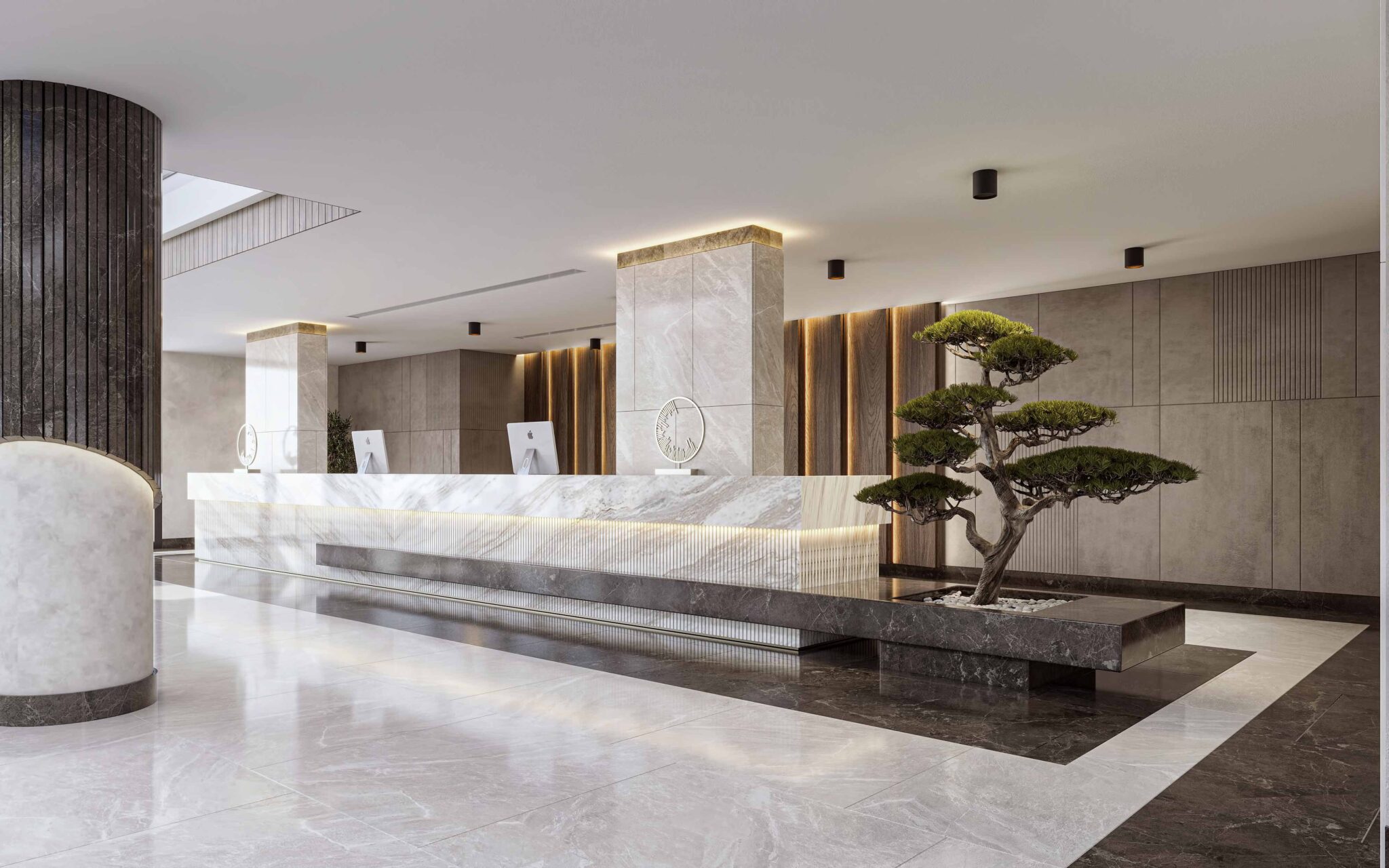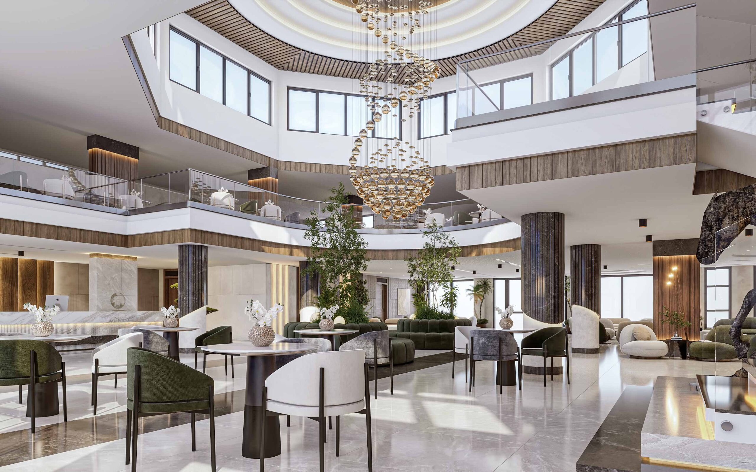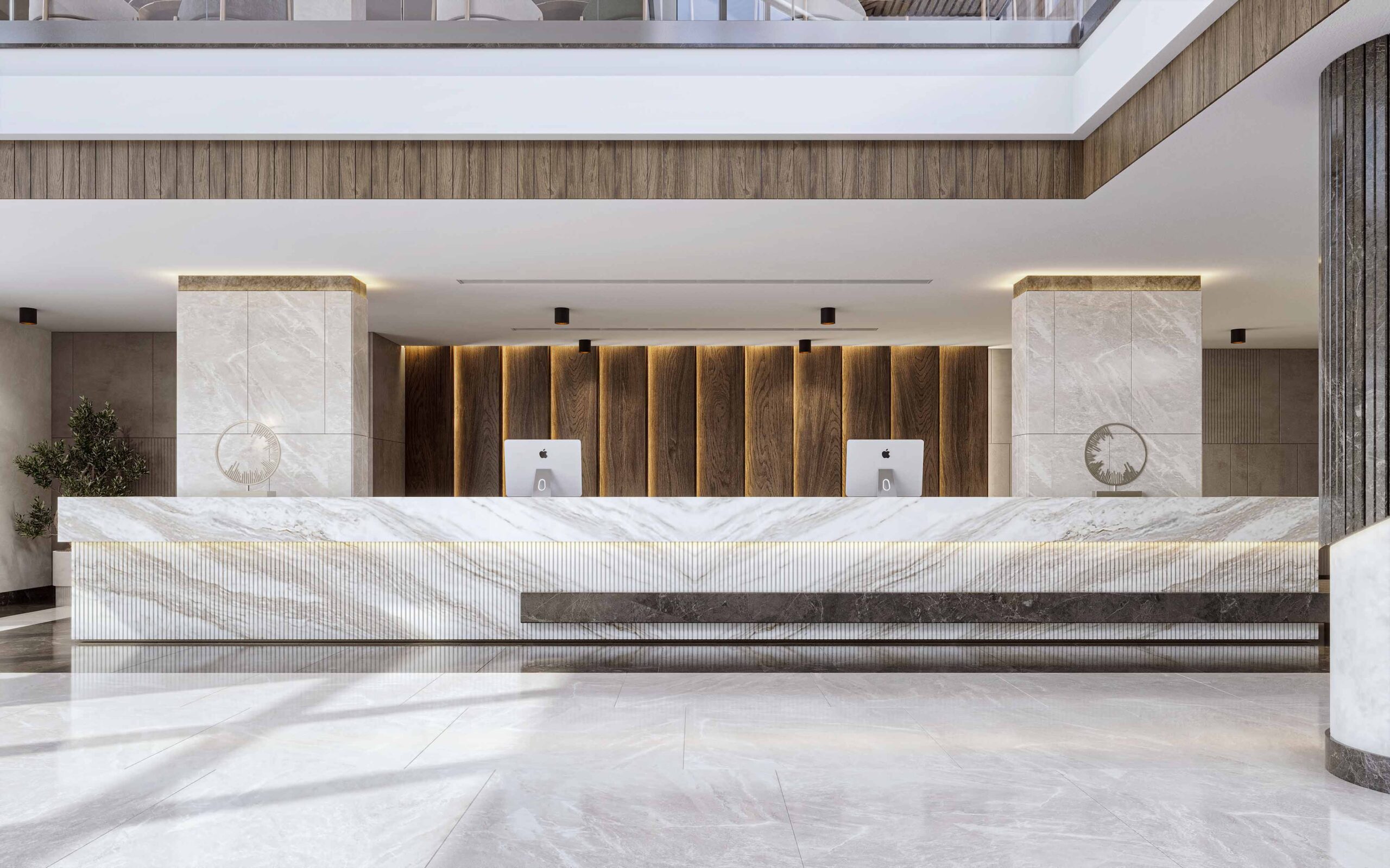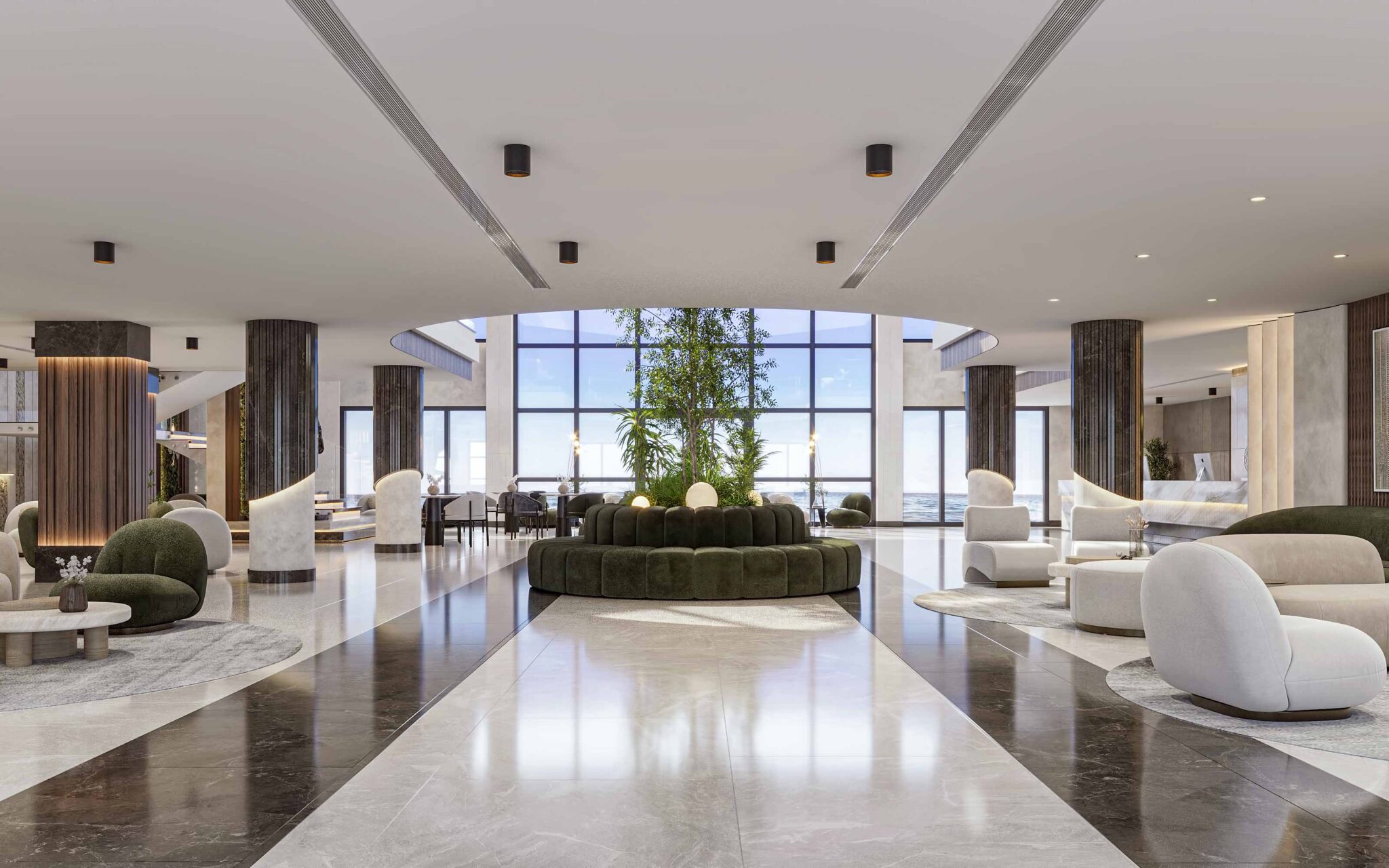 Zia company has the credit for designing the hotel’s reception, it embodies a harmonious blend of modern luxury and natural elegance, featuring exquisite marble and rich wood elements that create a welcoming ambiance. The striking design is accentuated by a large opening, offering guests a breathtaking view that transforms their arrival into an unforgettable experience. With every detail thoughtfully curated, the space invites visitors to relax.