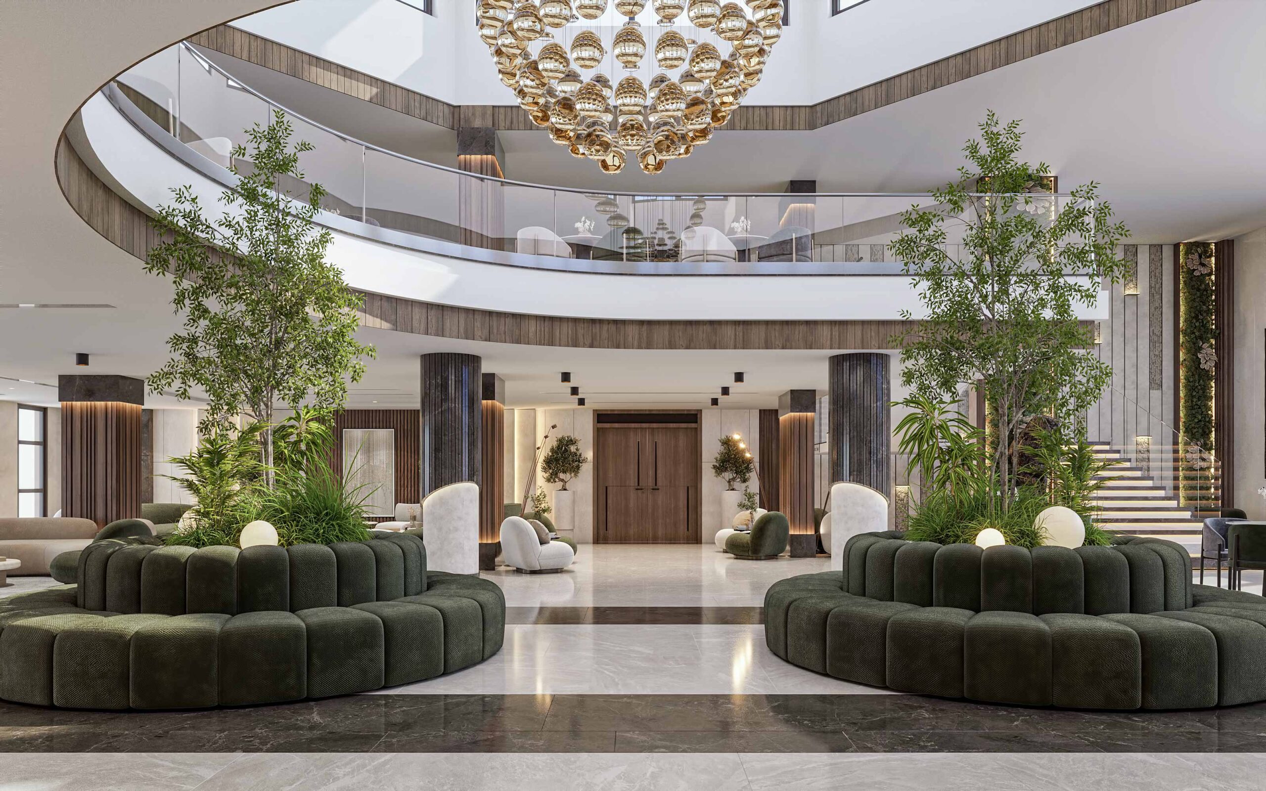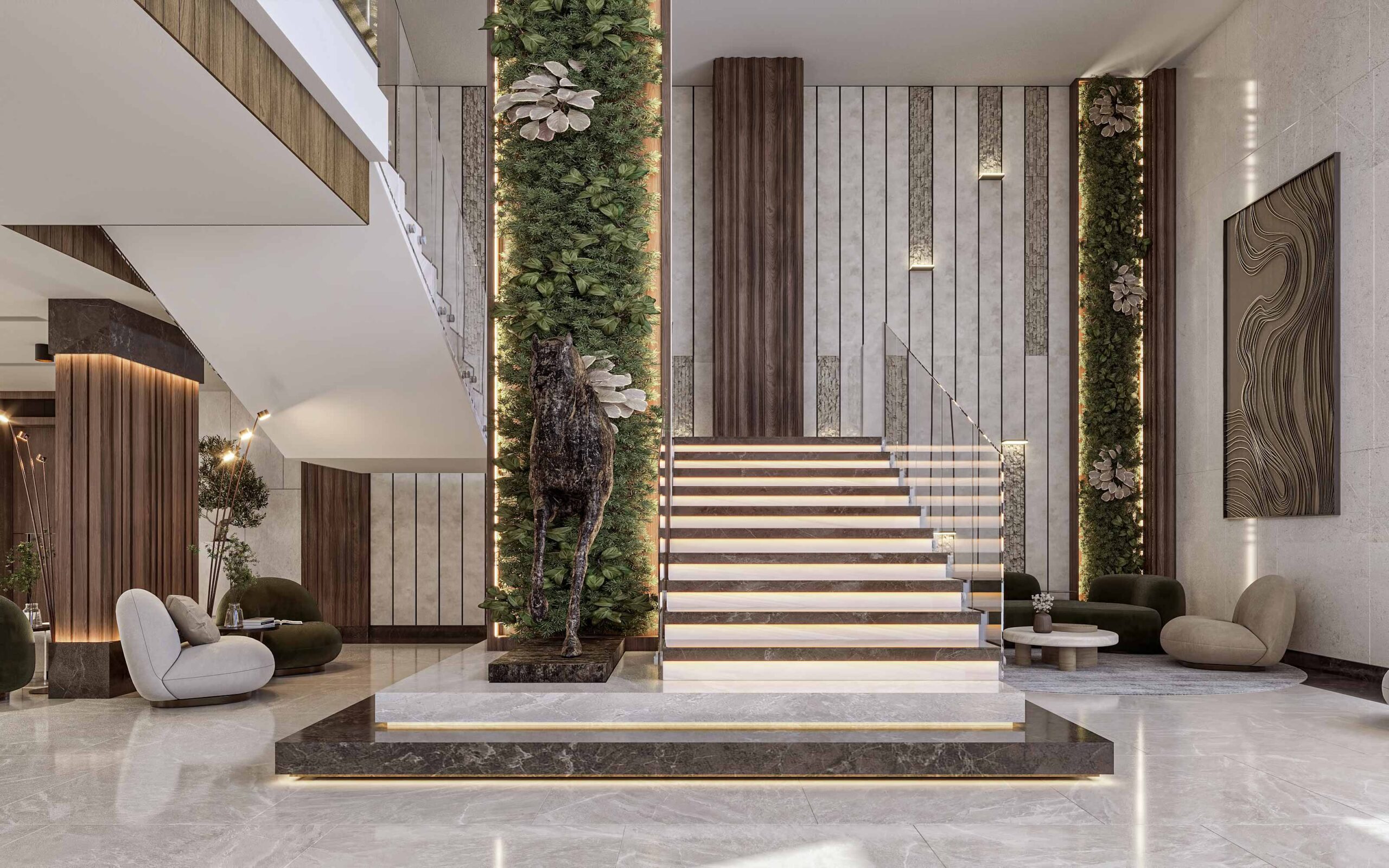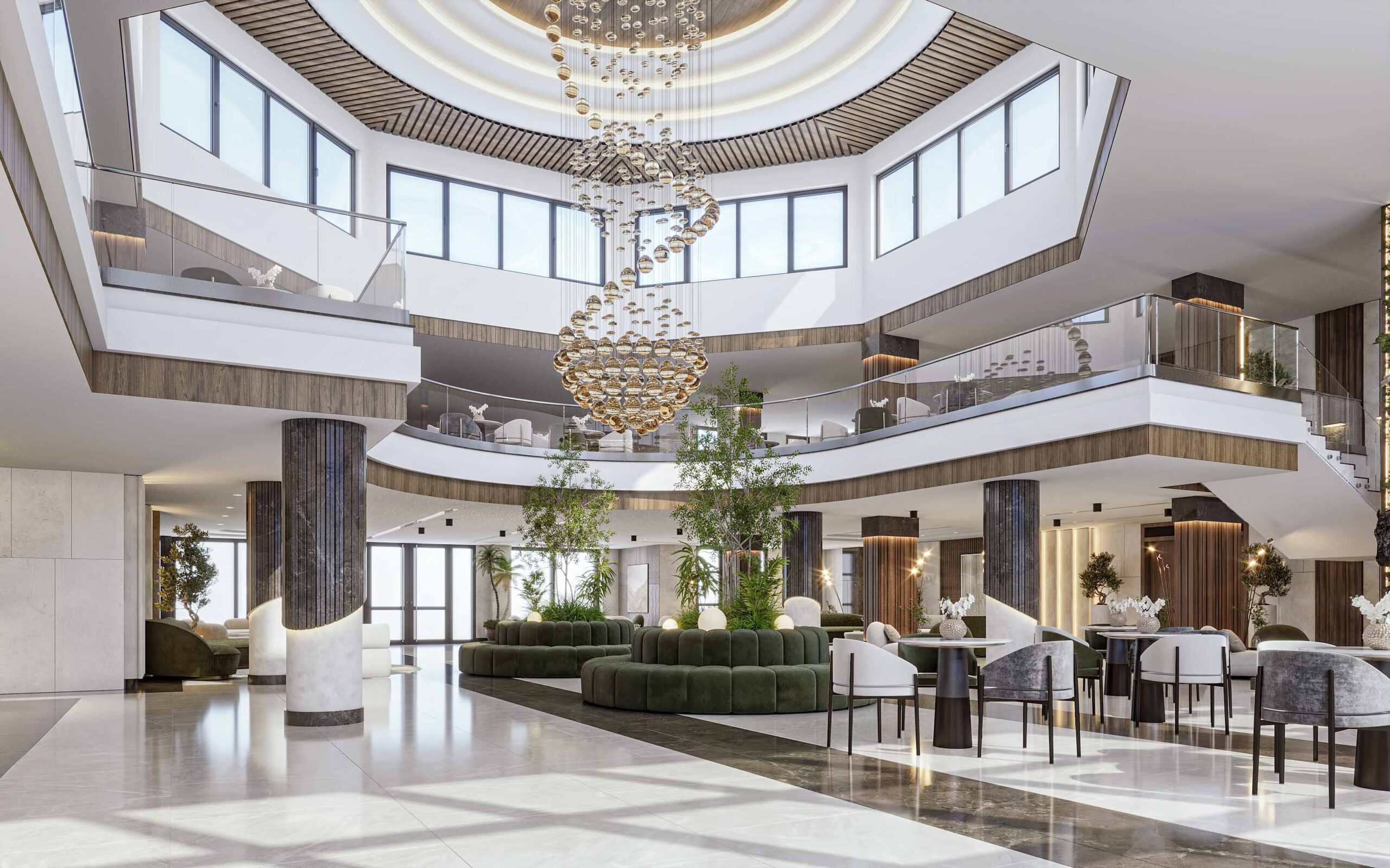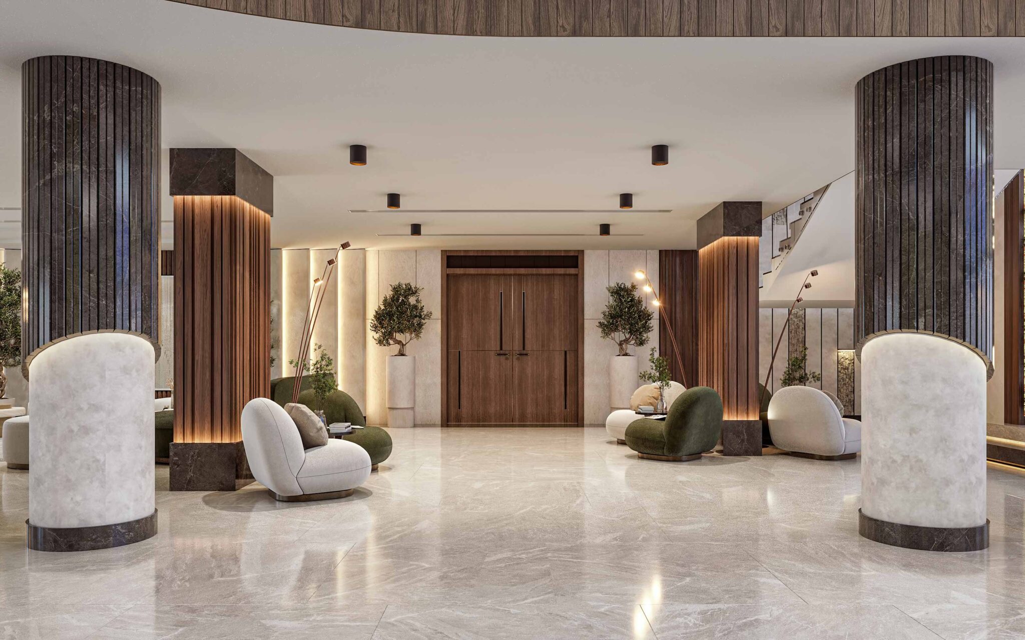 Zia company has the credit for designing the hotel’s reception, it embodies a harmonious blend of modern luxury and natural elegance, featuring exquisite marble and rich wood elements that create a welcoming ambiance. The striking design is accentuated by a large opening, offering guests a breathtaking view that transforms their arrival into an unforgettable experience. With every detail thoughtfully curated, the space invites visitors to relax.