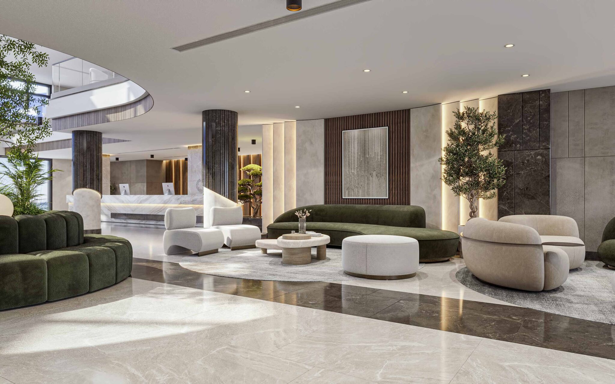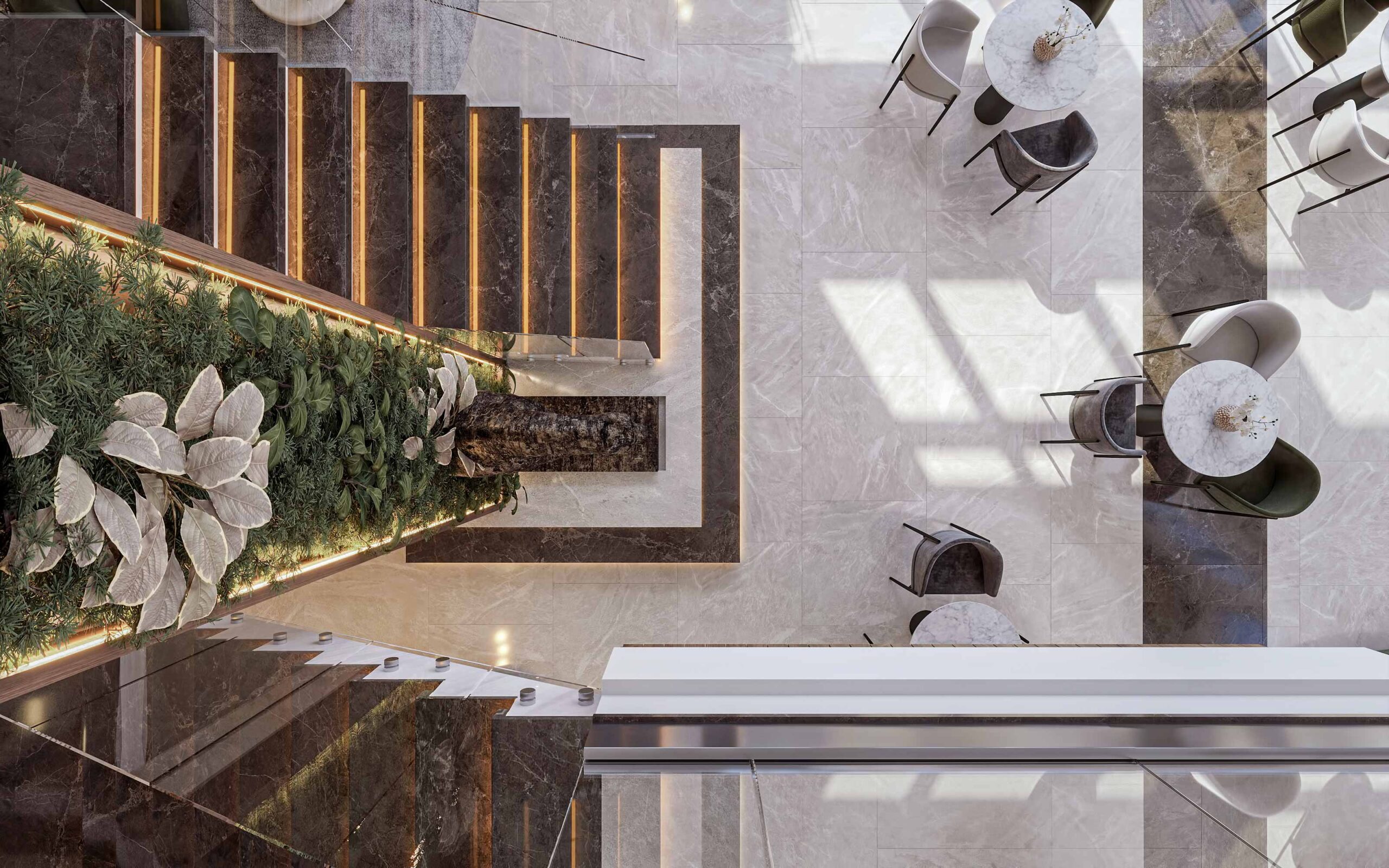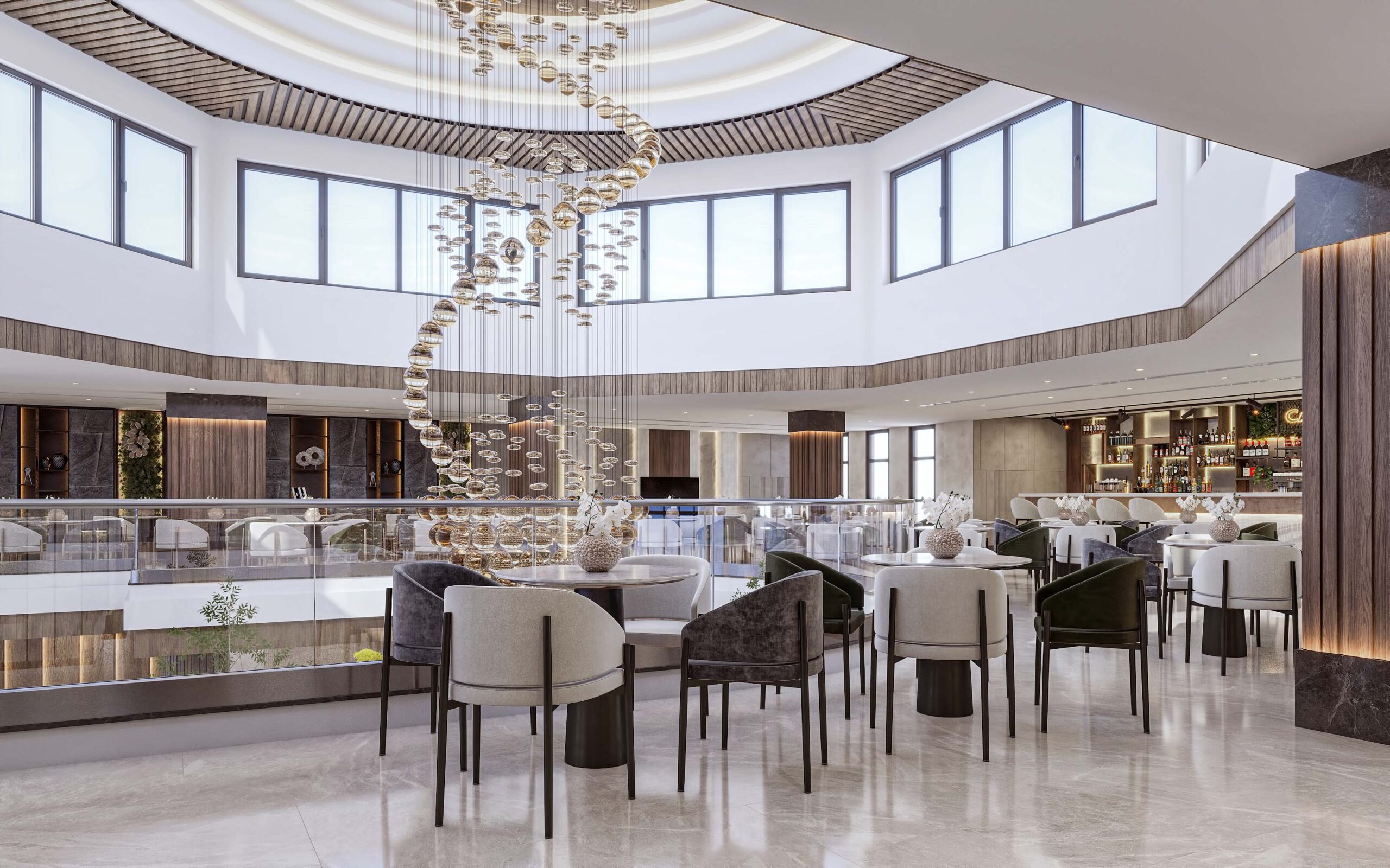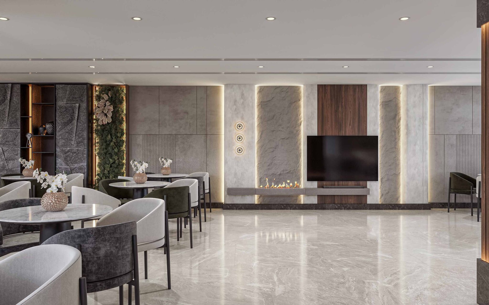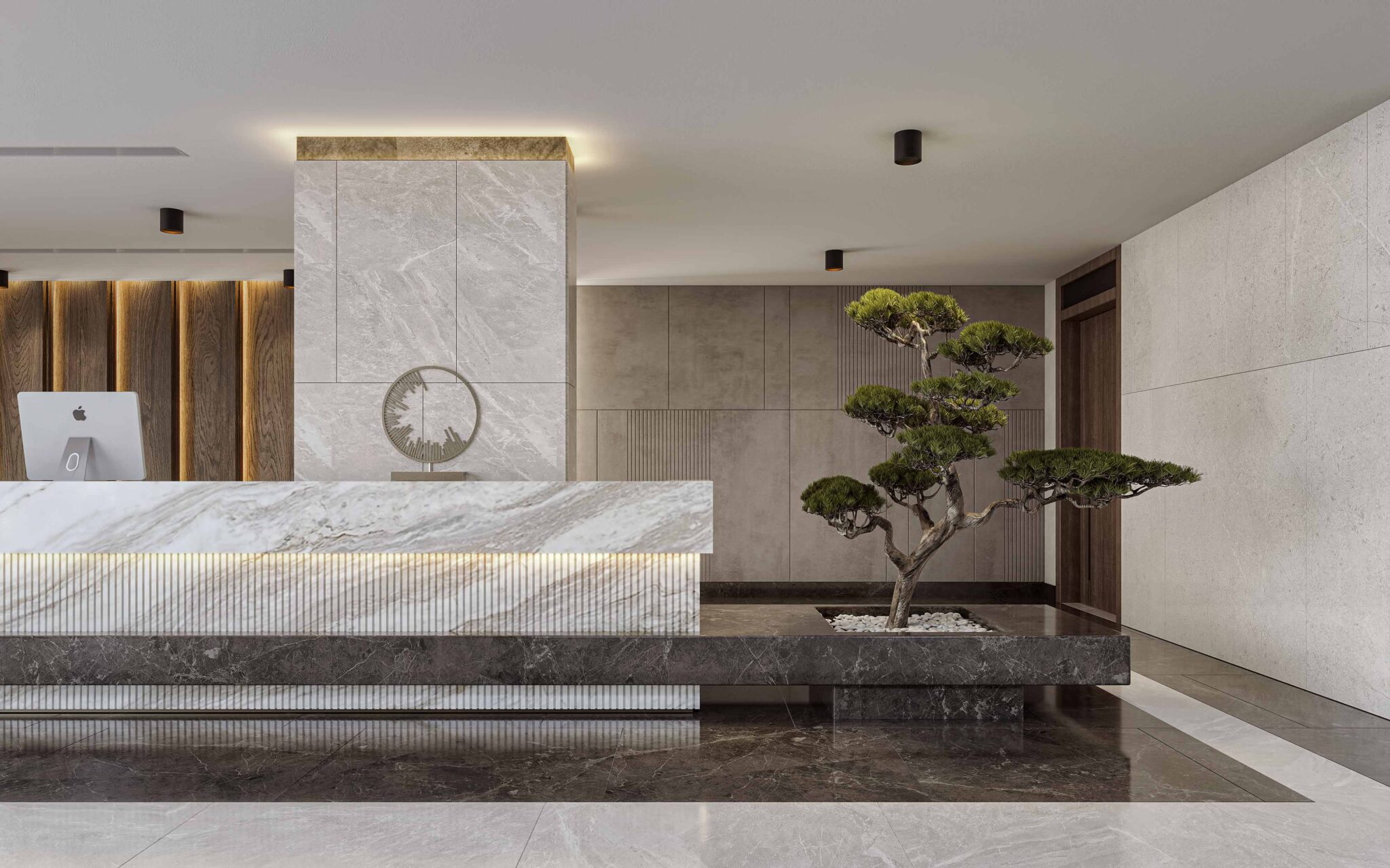 Zia company has the credit for designing the hotel’s reception, it embodies a harmonious blend of modern luxury and natural elegance, featuring exquisite marble and rich wood elements that create a welcoming ambiance. The striking design is accentuated by a large opening, offering guests a breathtaking view that transforms their arrival into an unforgettable experience. With every detail thoughtfully curated, the space invites visitors to relax.