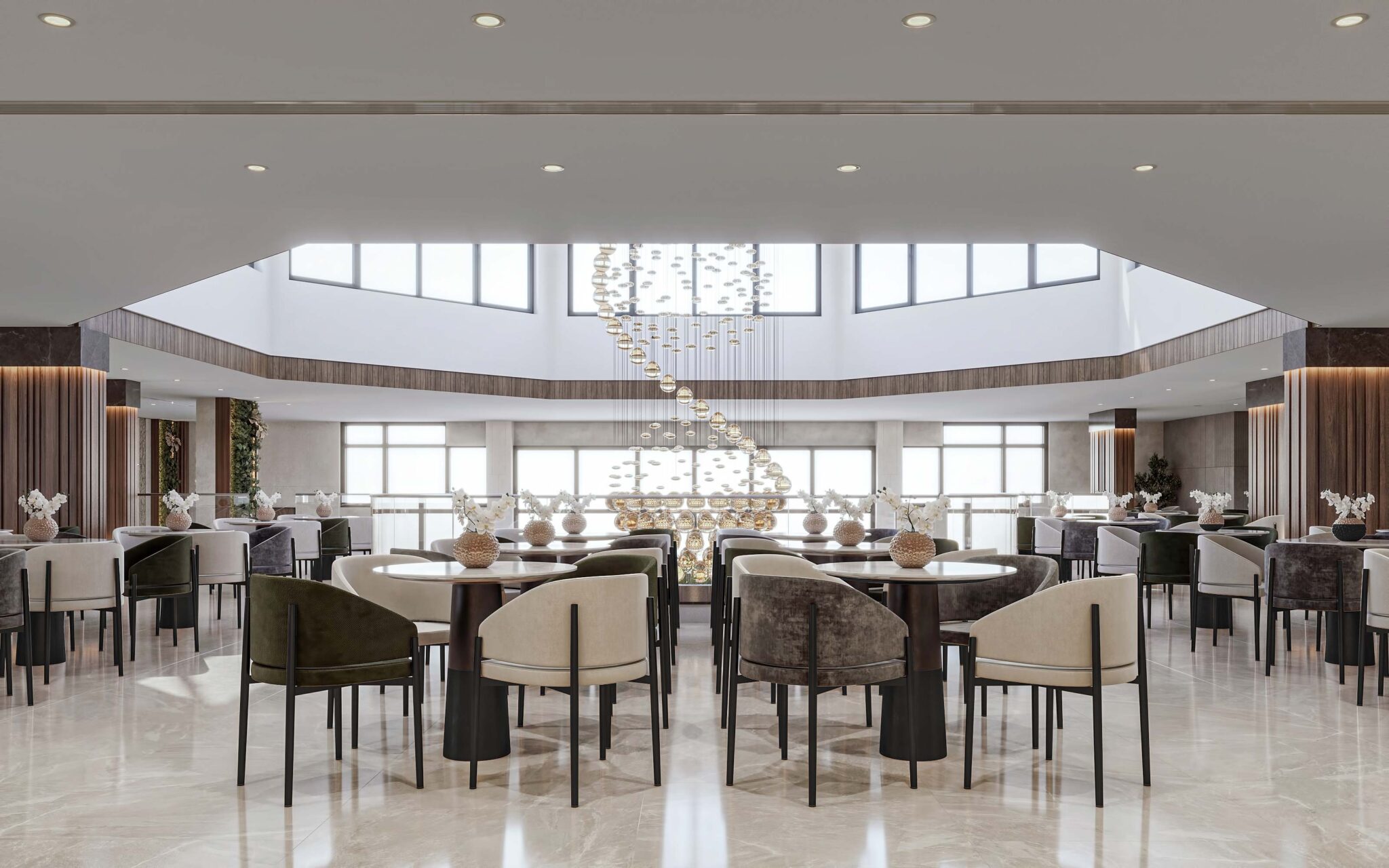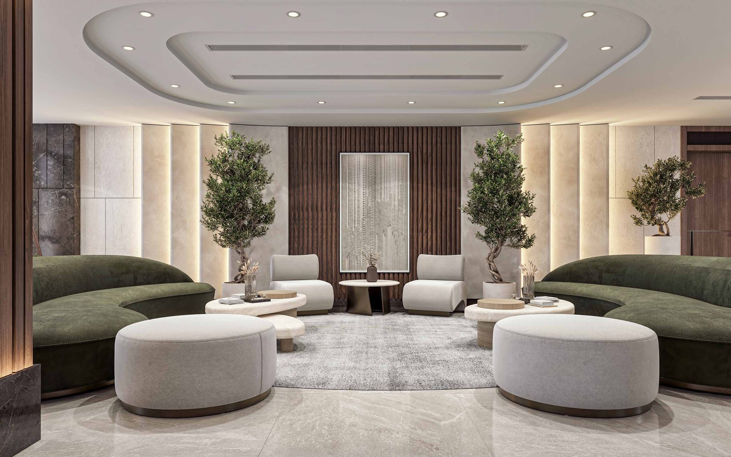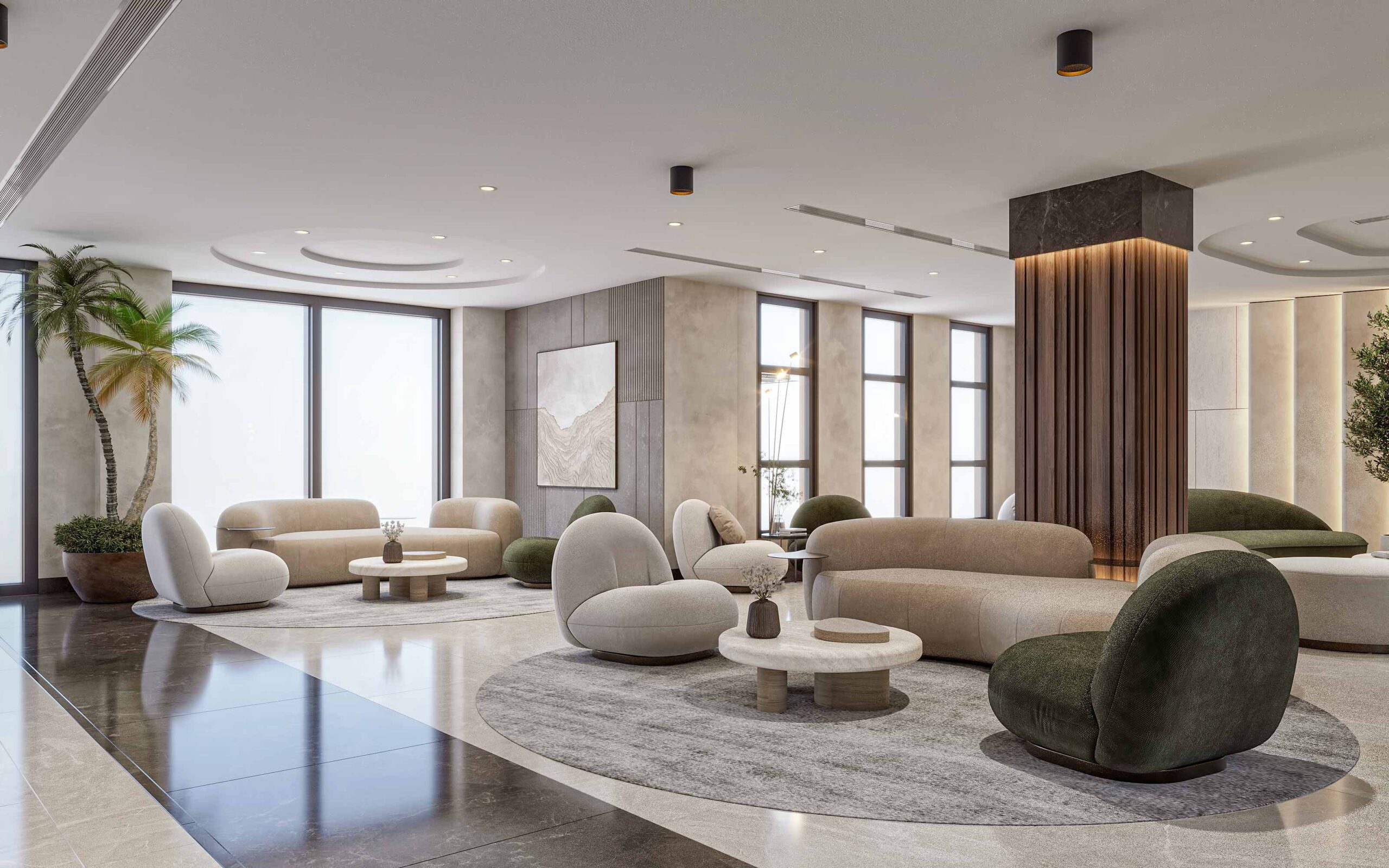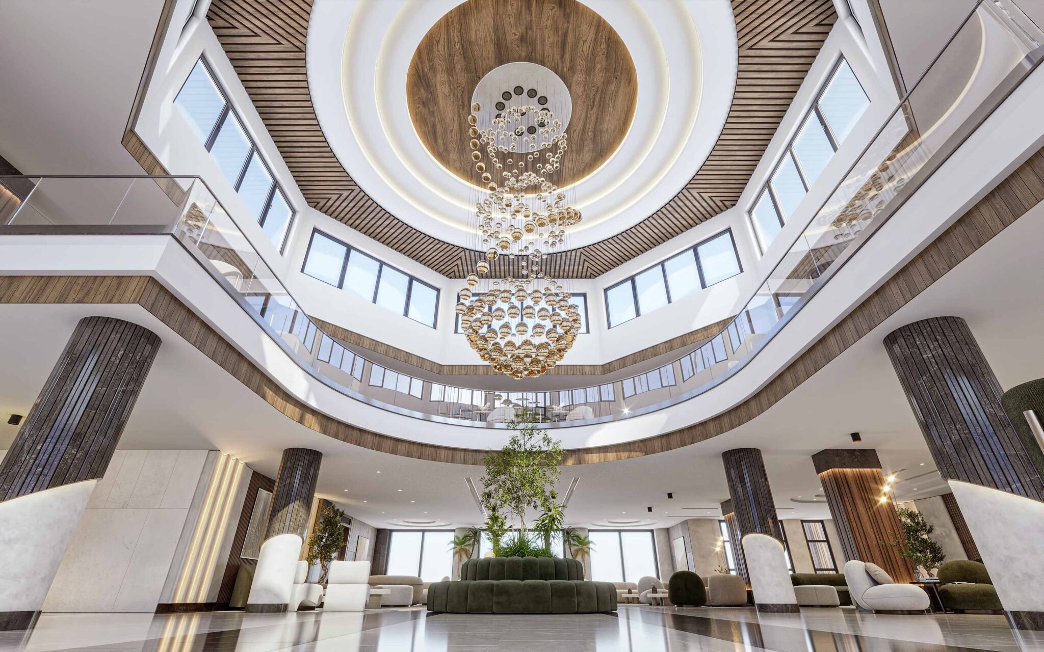 Zia company has the credit for designing the hotel’s reception, it embodies a harmonious blend of modern luxury and natural elegance, featuring exquisite marble and rich wood elements that create a welcoming ambiance. The striking design is accentuated by a large opening, offering guests a breathtaking view that transforms their arrival into an unforgettable experience. With every detail thoughtfully curated, the space invites visitors to relax.