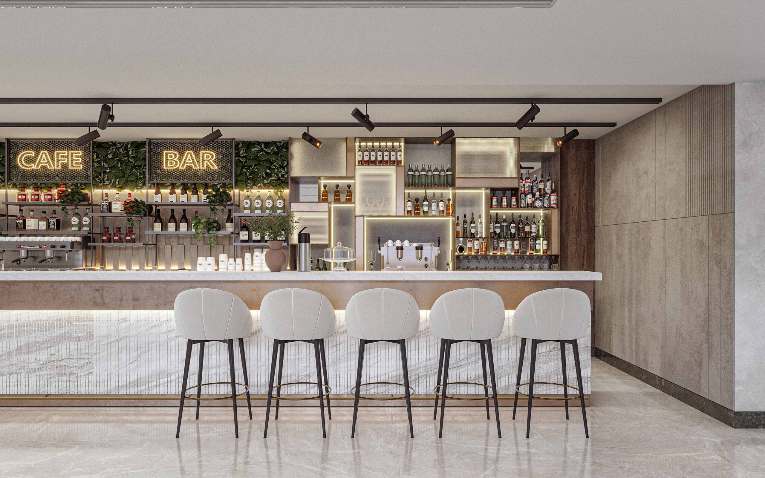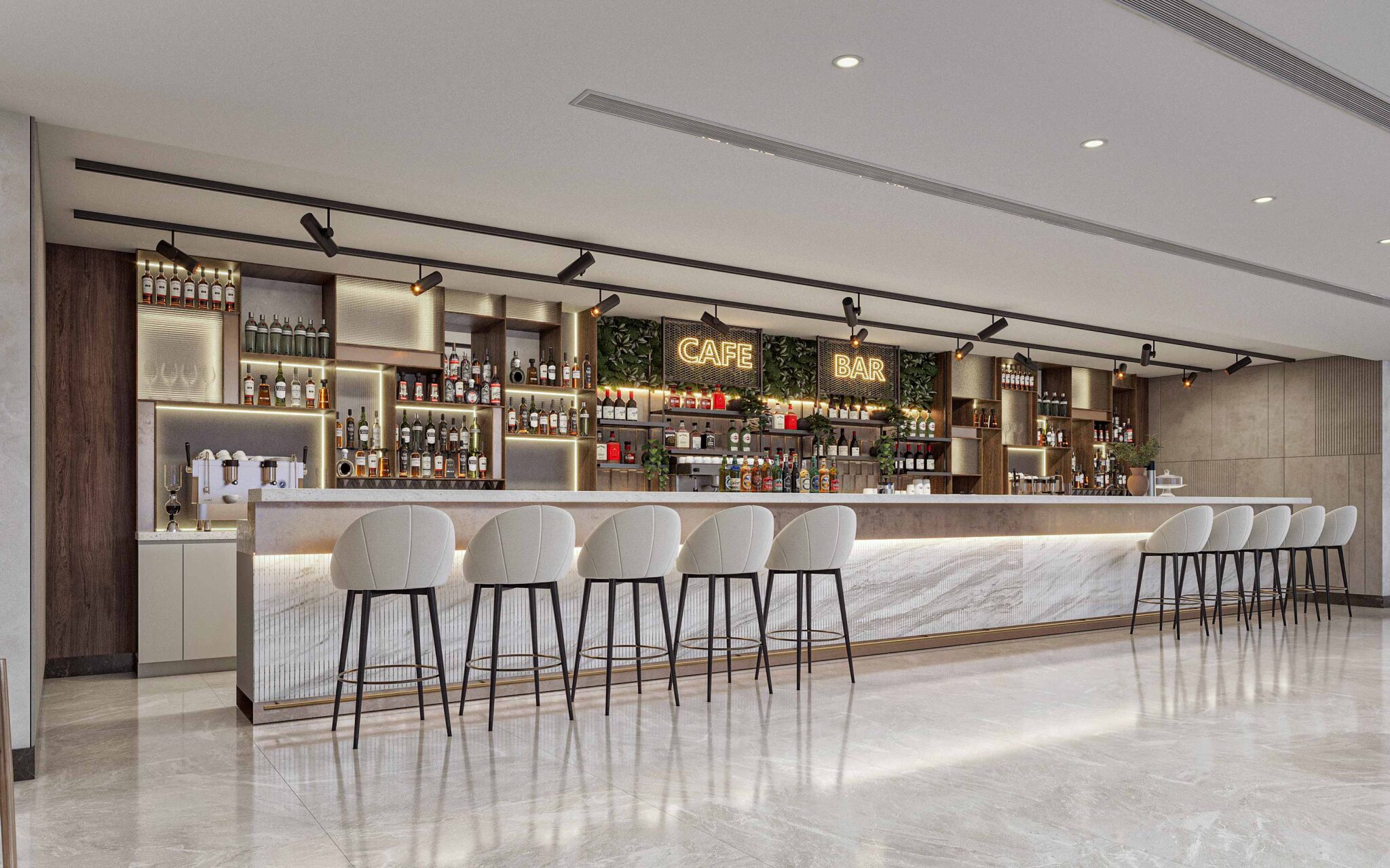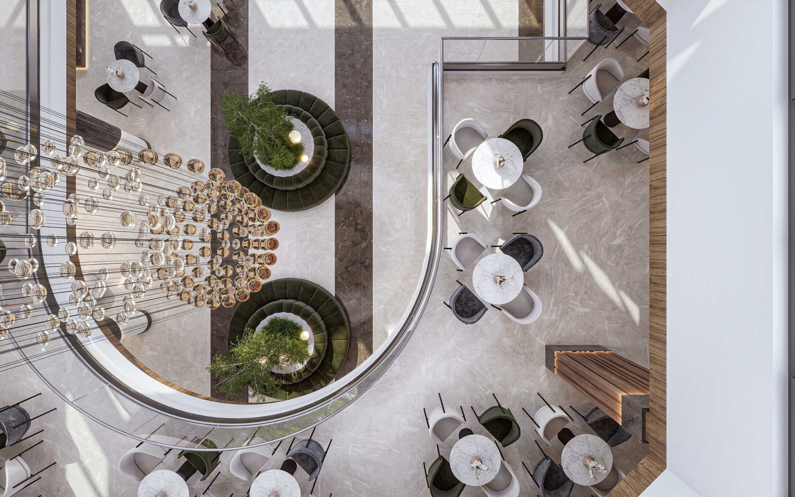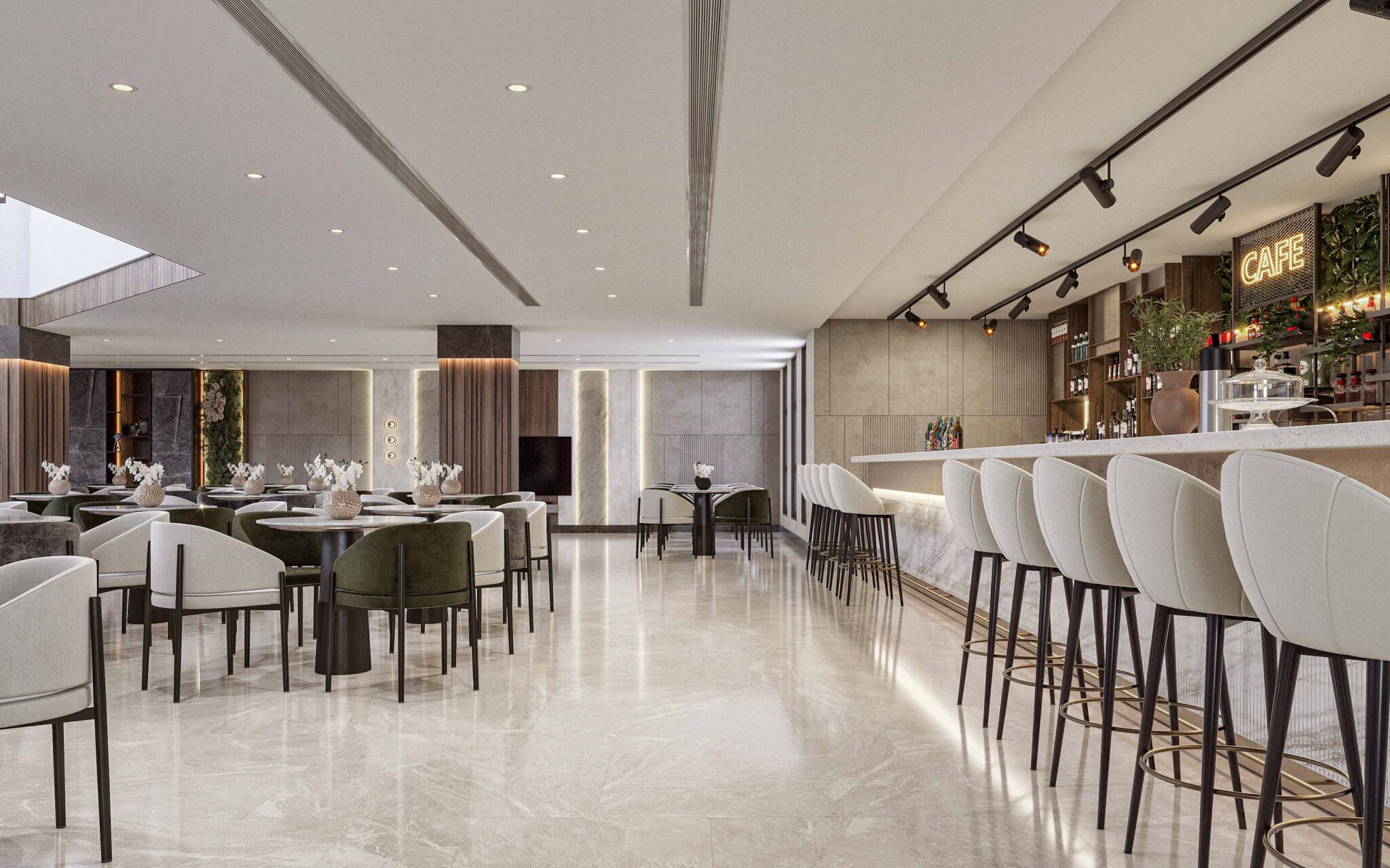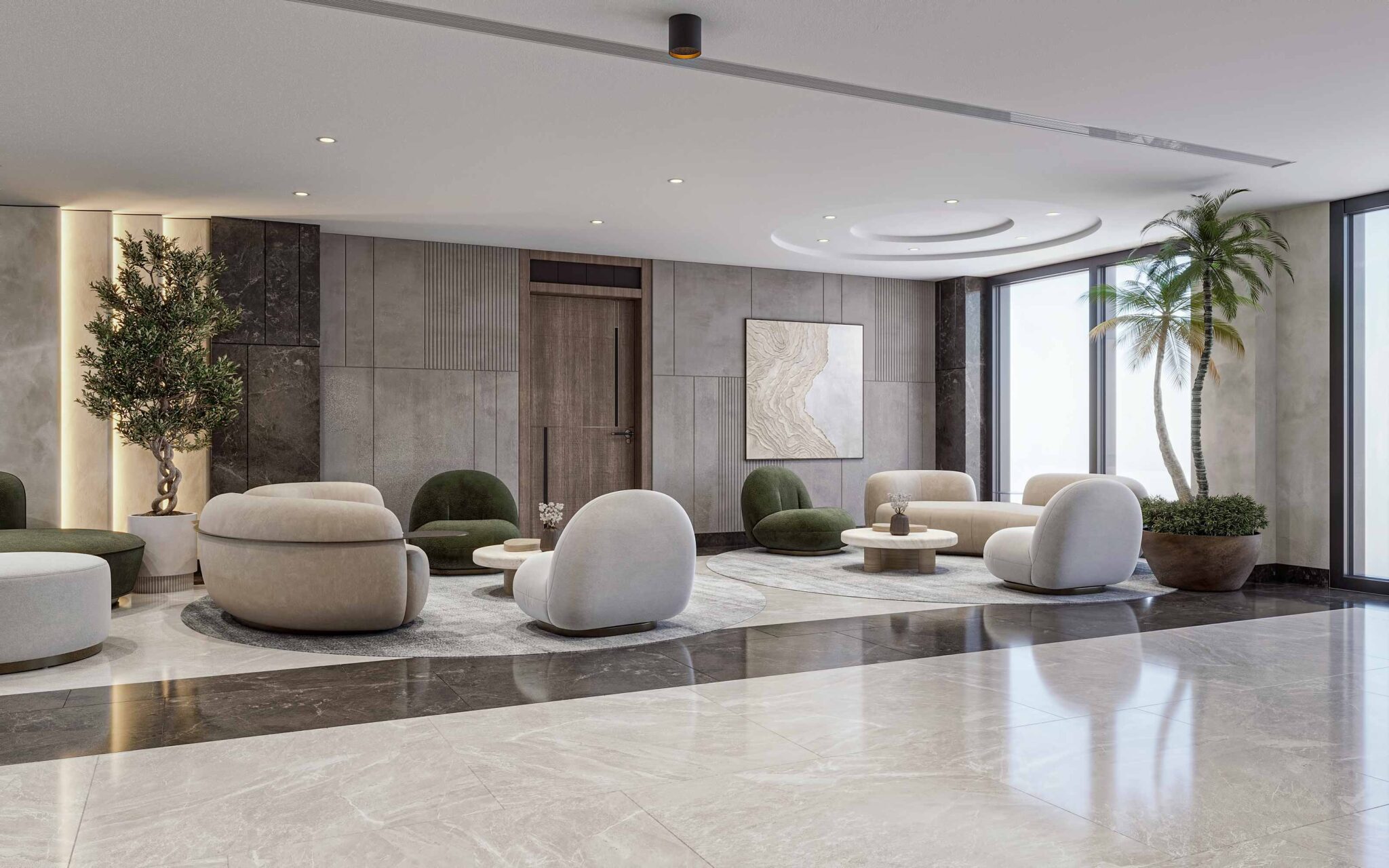 Zia company has the credit for designing the hotel’s reception, it embodies a harmonious blend of modern luxury and natural elegance, featuring exquisite marble and rich wood elements that create a welcoming ambiance. The striking design is accentuated by a large opening, offering guests a breathtaking view that transforms their arrival into an unforgettable experience. With every detail thoughtfully curated, the space invites visitors to relax.