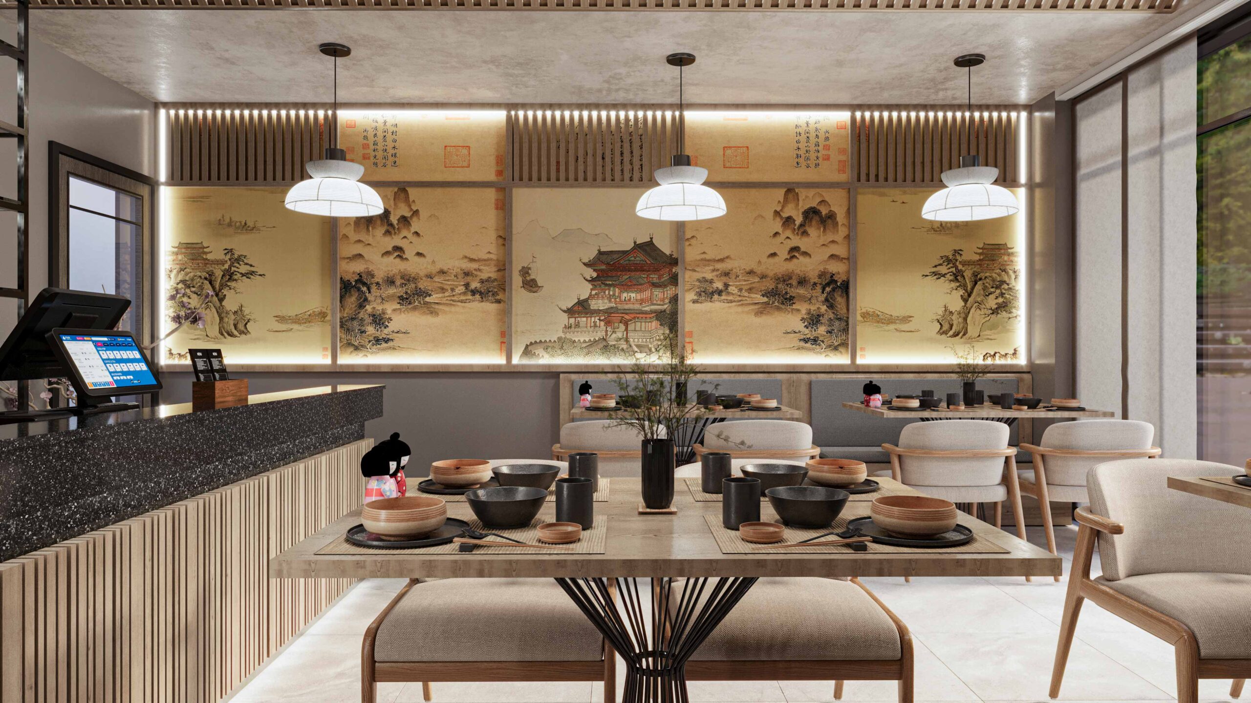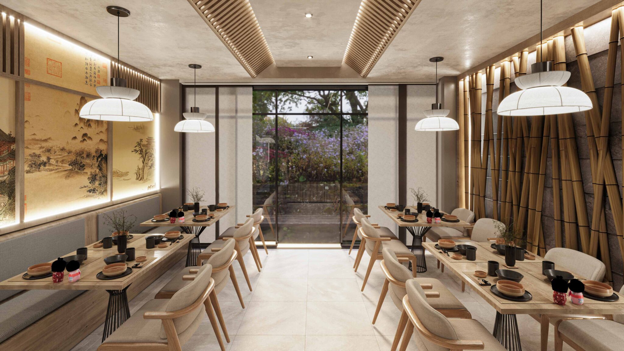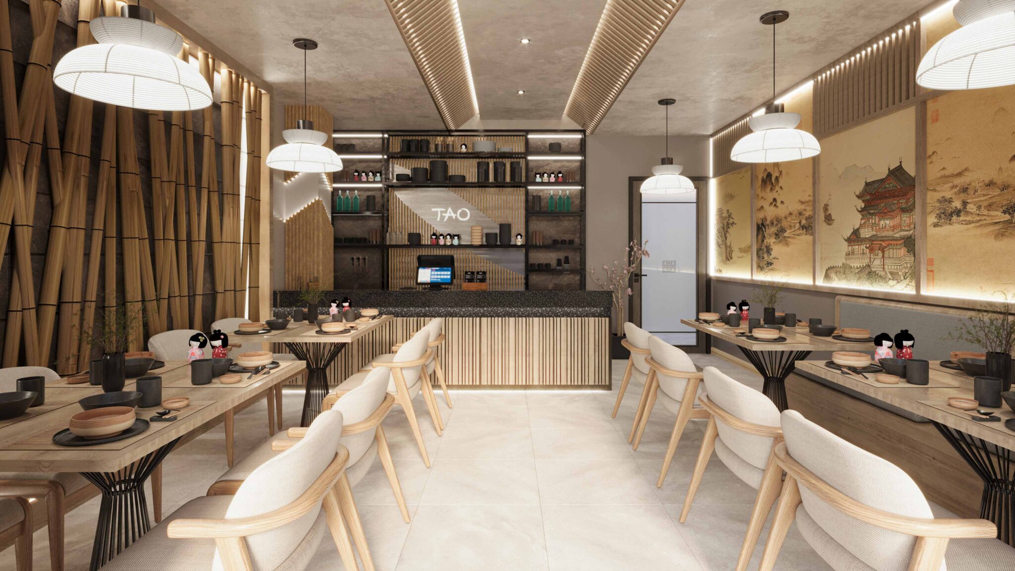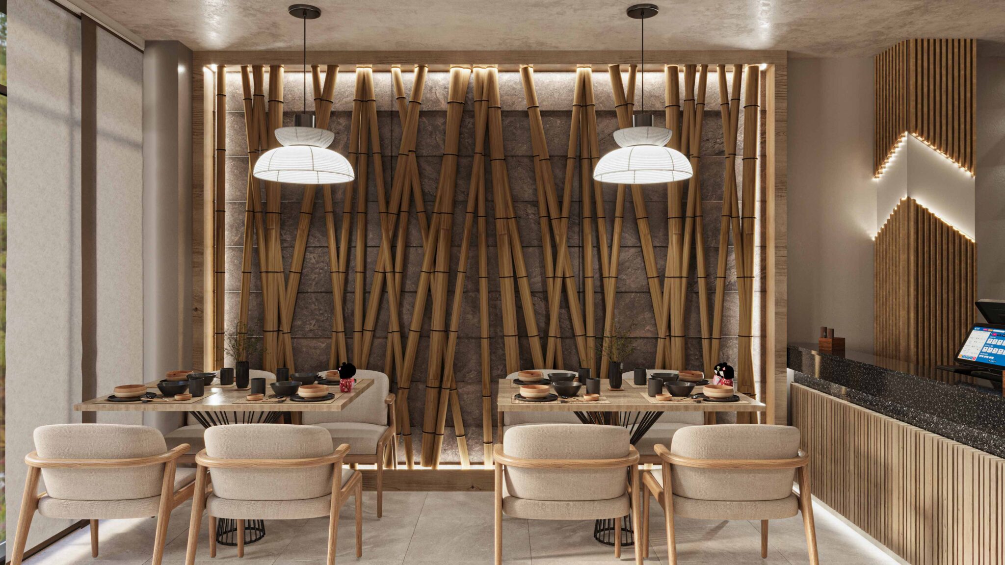 Zia company has the credit for designing a hotel restaurant interior in the Wabi-Sabi Japanese style, emphasizing natural beauty, simplicity, and the art of imperfection. The restaurant features raw, organic materials, soft neutral tones, and minimalist furnishings that create a serene and welcoming atmosphere. The design invites guests to experience a calming dining environment, where the focus is on the authenticity of both the space and the culinary experience.