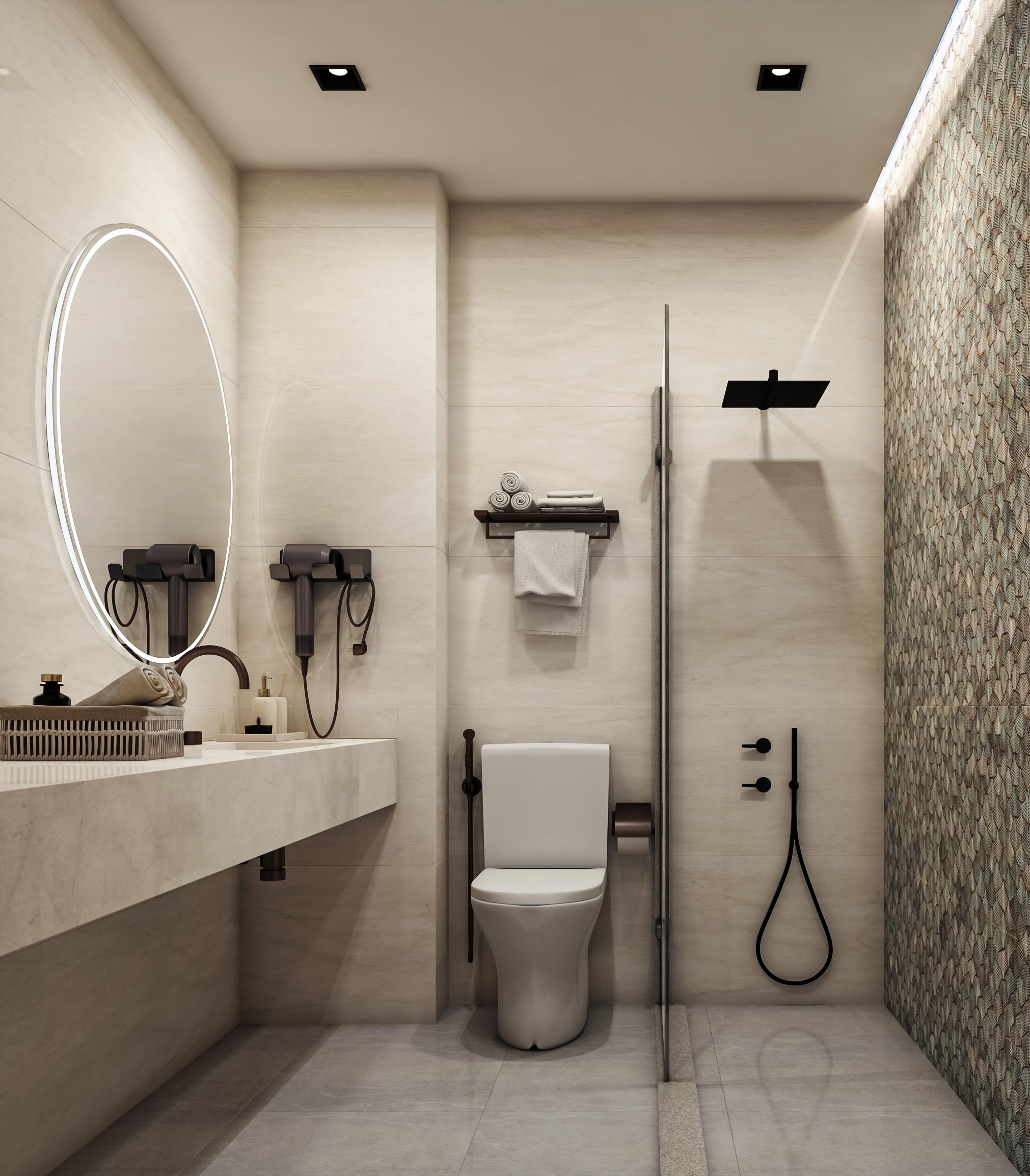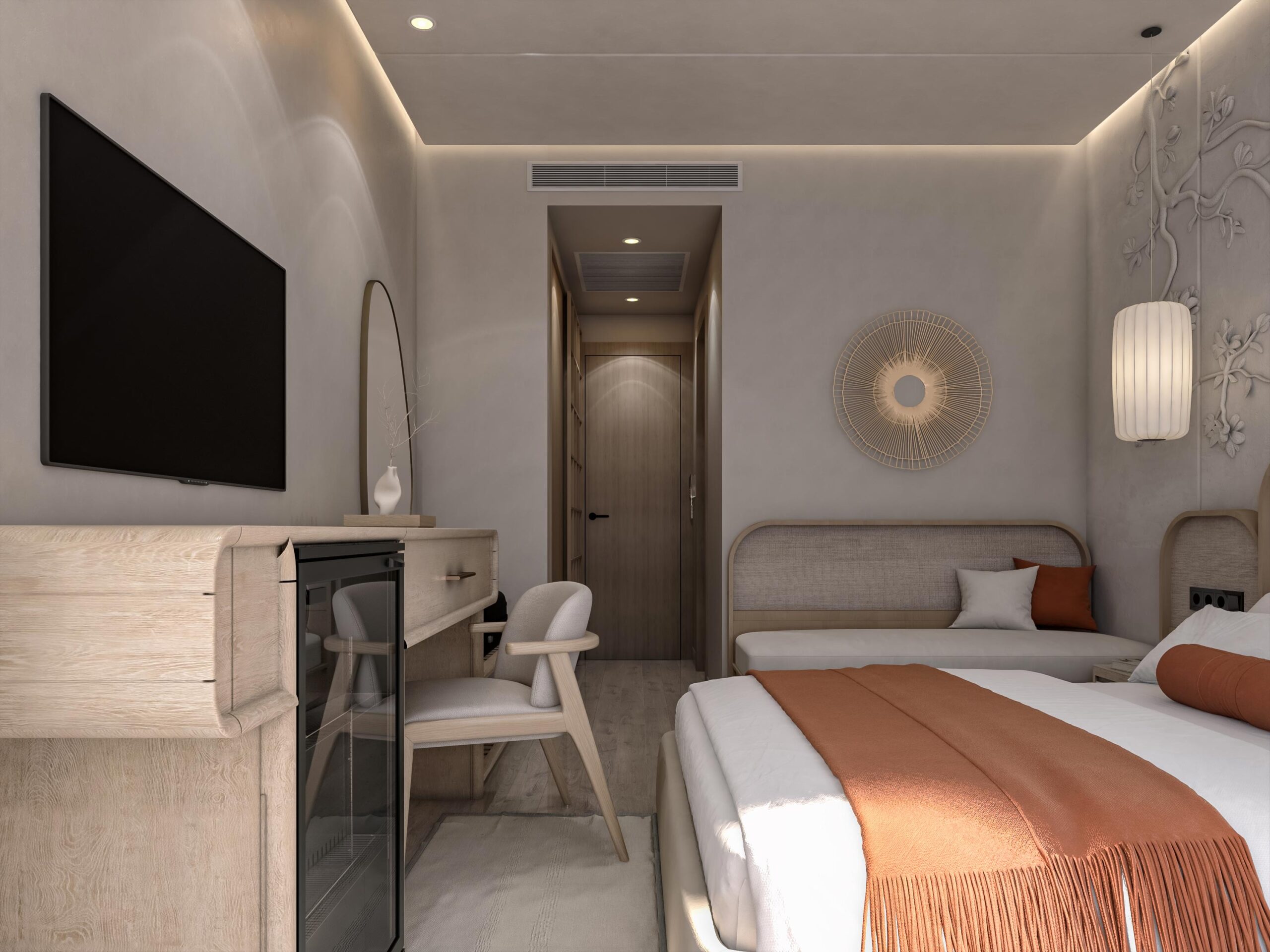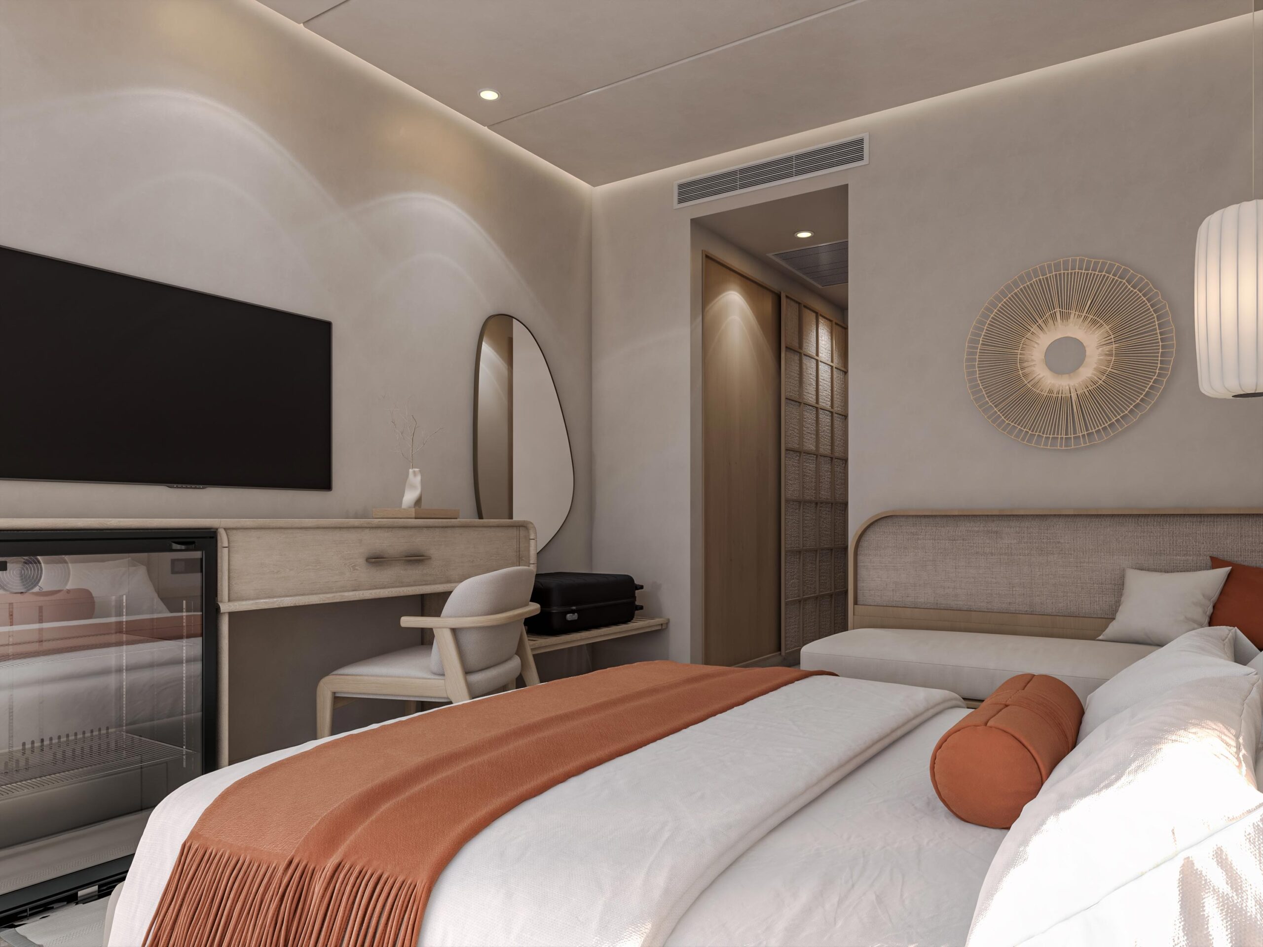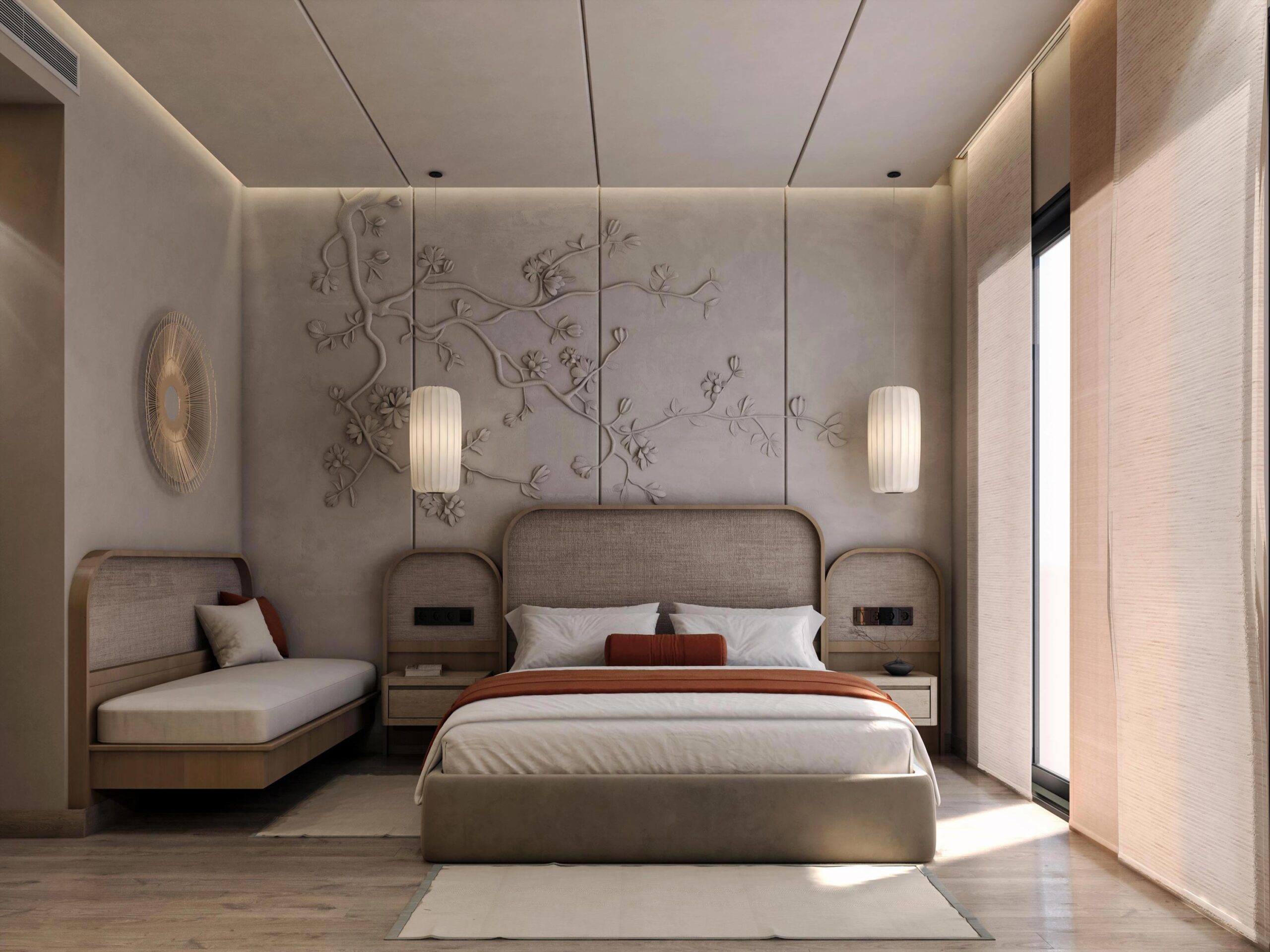 Zia company has the credit for designing a hotel room in the Wabi-Sabi style, focusing on the beauty of simplicity and the natural imperfections of materials. The room features a serene color palette, organic textures, and minimalist furnishings that create a calming and harmonious environment. Each element is thoughtfully chosen to highlight the elegance of imperfection and provide guests with a tranquil, refined space that embodies the essence of Wabi-Sabi aesthetics.